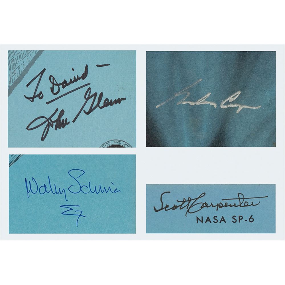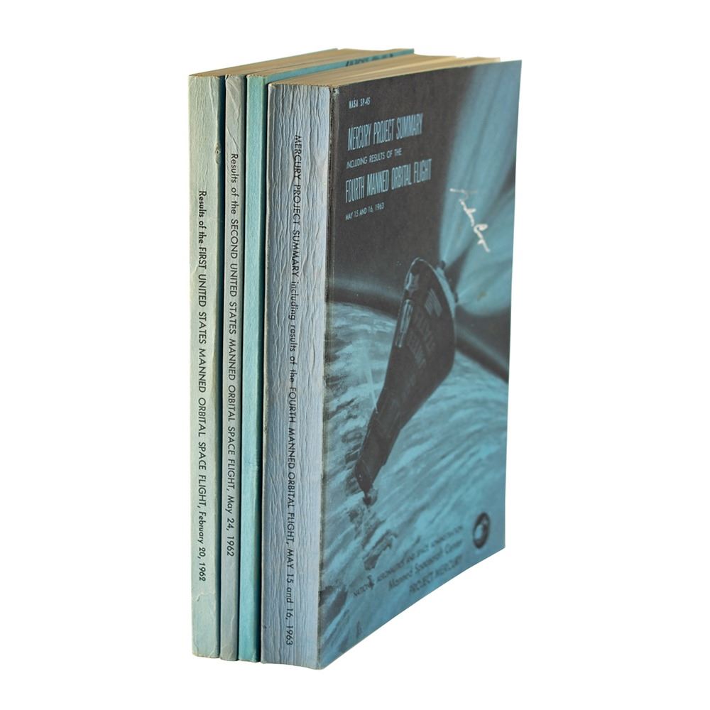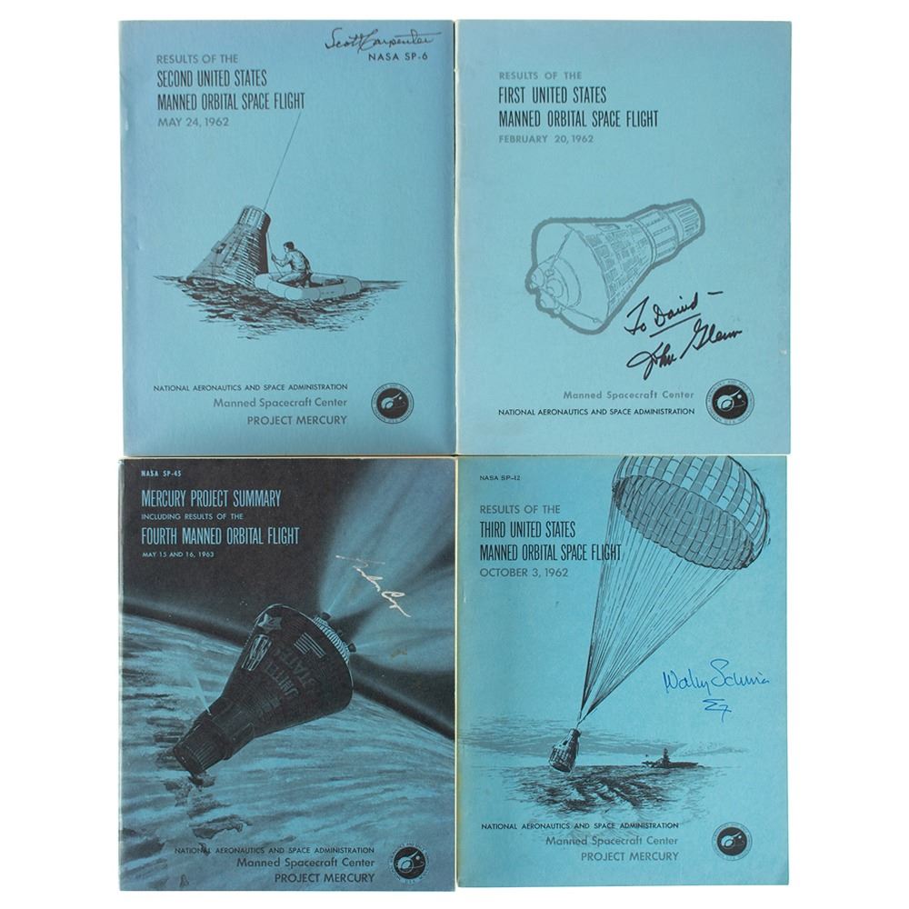 Very desirable set of four official NASA softcover books relating to the Mercury Program’s first four orbital spaceflights, each signed on the front cover by the mission’s respective pilot, with titles as follows: Results of the First United States Manned Orbital Space Flight, signed and inscribed in black felt tip, “To David—John Glenn”; Results of the Second United States Manned Orbital Space Flight, signed in black ink, “Scott Carpenter”; Results of the Third United States Manned Orbital Space Flight, signed in blue ink, “Wally Schirra” who adds a Sigma 7 symbol; and Results of the Fourth United States Manned Orbital Space Flight, signed in silver ink by Gordon Cooper. In overall fine condition, with light sunning to the spines. A scarce and sought-after set featuring autographs by the final four pilots of the historic Mercury Program.