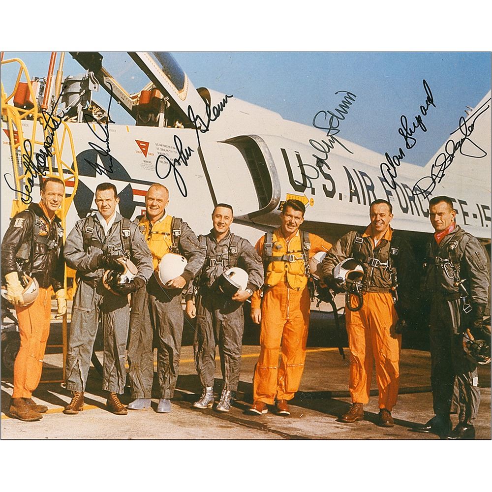 Color satin-finish 14 x 11 photo of all seven Mercury astronauts posing in front of an Air Force jet, signed in black felt tip by Scott Carpenter, Gordon Cooper, John Glenn, Wally Schirra, Alan Shepard, and Deke Slayton. In very good to fine condition, with creasing primarily along the top and bottom edges.