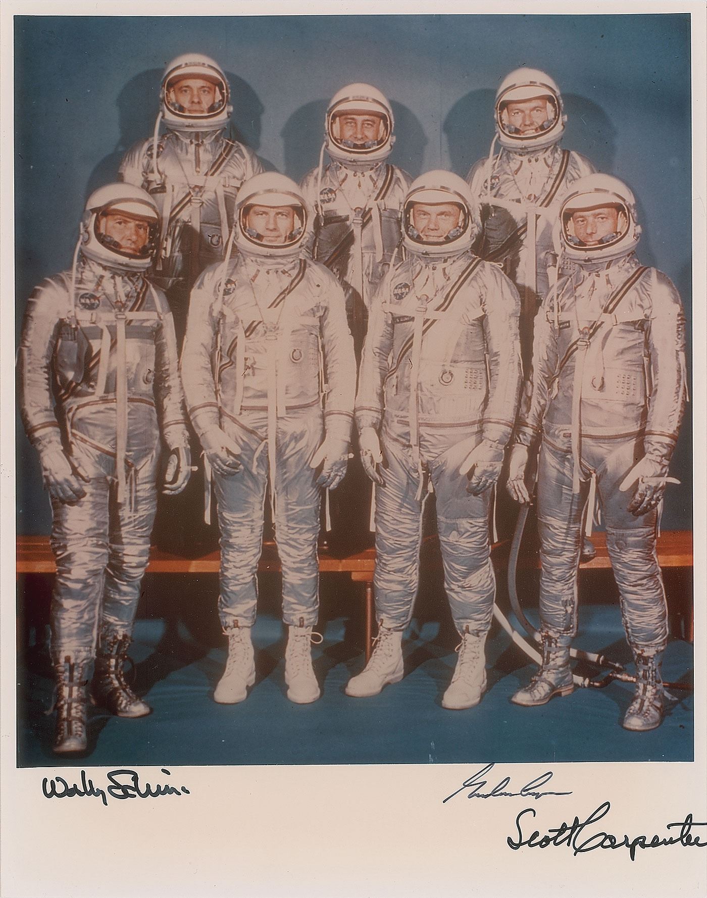 Beautiful color glossy 8 x 10 photo of the original seven Mercury astronauts posing together in their space suits, signed in the lower border in black felt tip by Wally Schirra, Gordon Cooper, and Scott Carpenter. In fine condition.