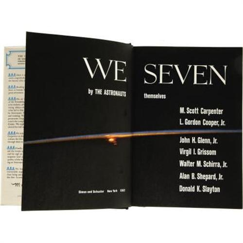<B>M. Scott Carpenter, L. Gordon Cooper, Jr., John H. Glenn, Jr., Virgil I. Grissom, Walter M. Schirra, Jr., Alan B. Shepard, Jr., and Donald K. Slayton: Signed </B></I><B><I>We Seven by the Astronauts Themselves</B></I></B></I> (New York: Simon and Schuster, 1962), first edition, 352 pages, illustrations, black-cloth binding with white lettering, dust jacket (in protective sleeve). Signed on the Simon and Schuster logo page by two of the astronauts: <I>“Walter Shirra”</B></I> and <I>“Scott Carpente</B></I>r”<I>.</B></I> The book is in very good condition with some tiny nicks at the corners and bottom back of the binding. The dust jacket is in very good condition with a scuff at the bottom of the spine and a chip out of the top back along the spine.<BR><BR><b>Shipping:</b> Books & Catalogs (<a target="_blank" href="http://www.heritageauctions.com/common/shipping.php">view shipping information</a>)
