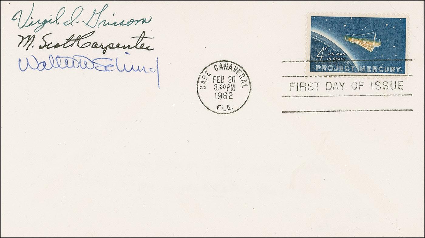 FDC honoring Project Mercury, signed in black ink “Virgil I. Grissom” and “M. Scott Carpenter” and in blue ink “Walter M. Schirra, Jr.” In fine condition.
