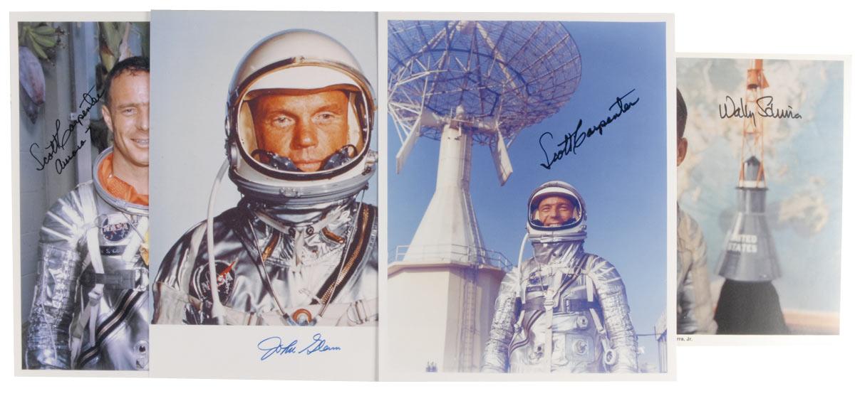 Four photos: three color satin-finish 8 x 10 photos, two of Scott Carpenter and one of John Glenn, each signed in blue or black felt tip respectively; and a color 10 x 8 NASA photo of Wally Schirra, signed in black felt tip. In fine overall condition.