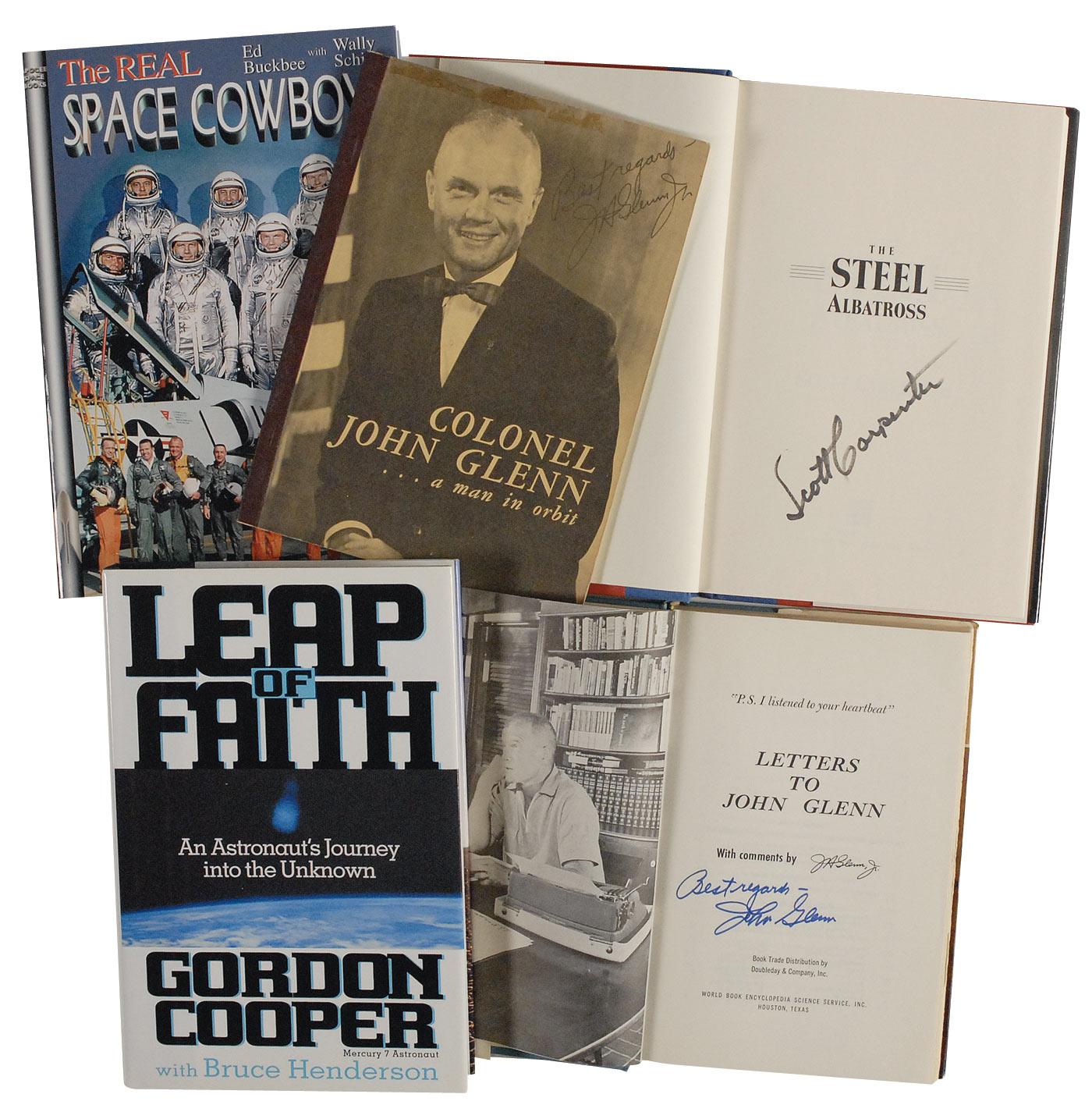 Four books, three hardcover and one softcover: The Steel Albatross, signed by Scott Carpenter; The Real Space Cowboys, signed by Wally Schirra; P.S. I Listened To Your Heartbeat, signed by John Glenn; and Leap Of Faith, signed by Gordon Cooper. In fine overall condition. Accompanied by an unsigned grade school reading pamphlet entitled Colonel John Glenn…a man in orbit.