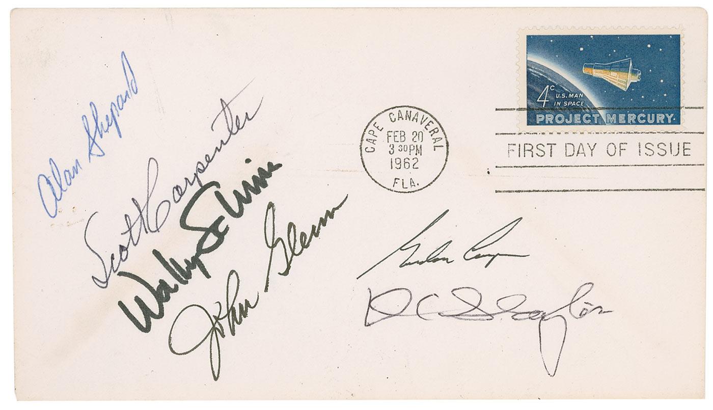 FDC with a cachet honoring Project Mercury, signed in ink by six of the original seven Mercury astronauts: Alan Shepard, John Glenn, Scott Carpenter, Wally Schirra, Gordon Cooper, and Deke Slayton. In fine condition, with a few spots of soiling and light toning from envelope glue just touching four of the names. According to our consignor, the signatures were all obtained at a 1991 Mercury Seven Foundation banquet celebrating the 30th anniversary of Shepard’s flight.