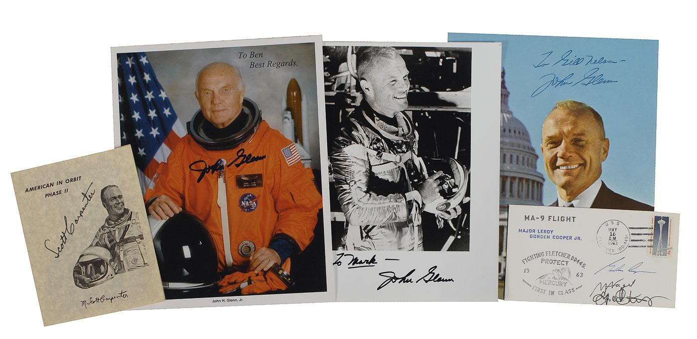 Five items: a glossy 8 x 10 photo of John Glenn in his Mercury space suit, signed and inscribed in black felt tip; a color 8 x 10 NASA photo of Glenn prior to his shuttle flight, signed in black felt tip and inscribed in type at the top; a color 8 x 10 cardstock photo of Glenn in Washington, D.C., signed and inscribed in blue felt tip; a souvenir booklet entitled American in Orbit Phase II, two pages, signed on the front cover in black felt tip by Scott Carpenter; and a commemorative cover bearing a stamped cachet honoring Gordon Cooper’s Mercury flight, signed in blue ink by Cooper and in black felt tip by two others. In fine overall condition.