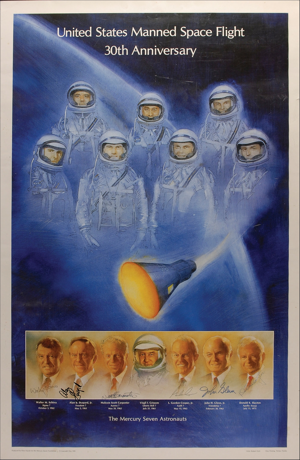 Color 34 x 22 poster honoring the 30th anniversary of Manned Space Flight, signed in ink and felt tip by Alan Shepard, John Glenn, Scott Carpenter, Wally Schirra, Gordon Cooper, and Deke Slayton. Scattered creases, dings, and surface marks, otherwise fine condition. Rolled.