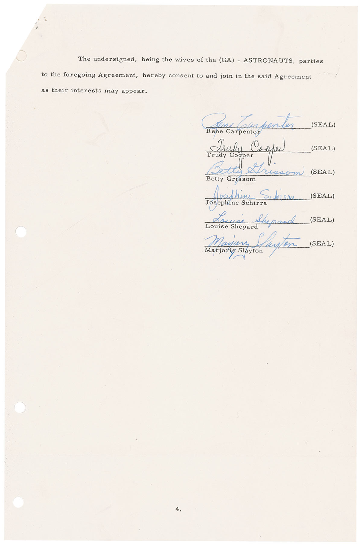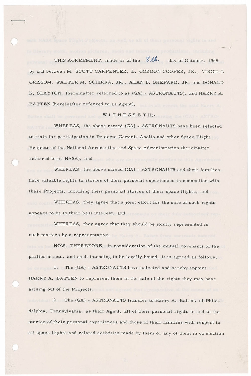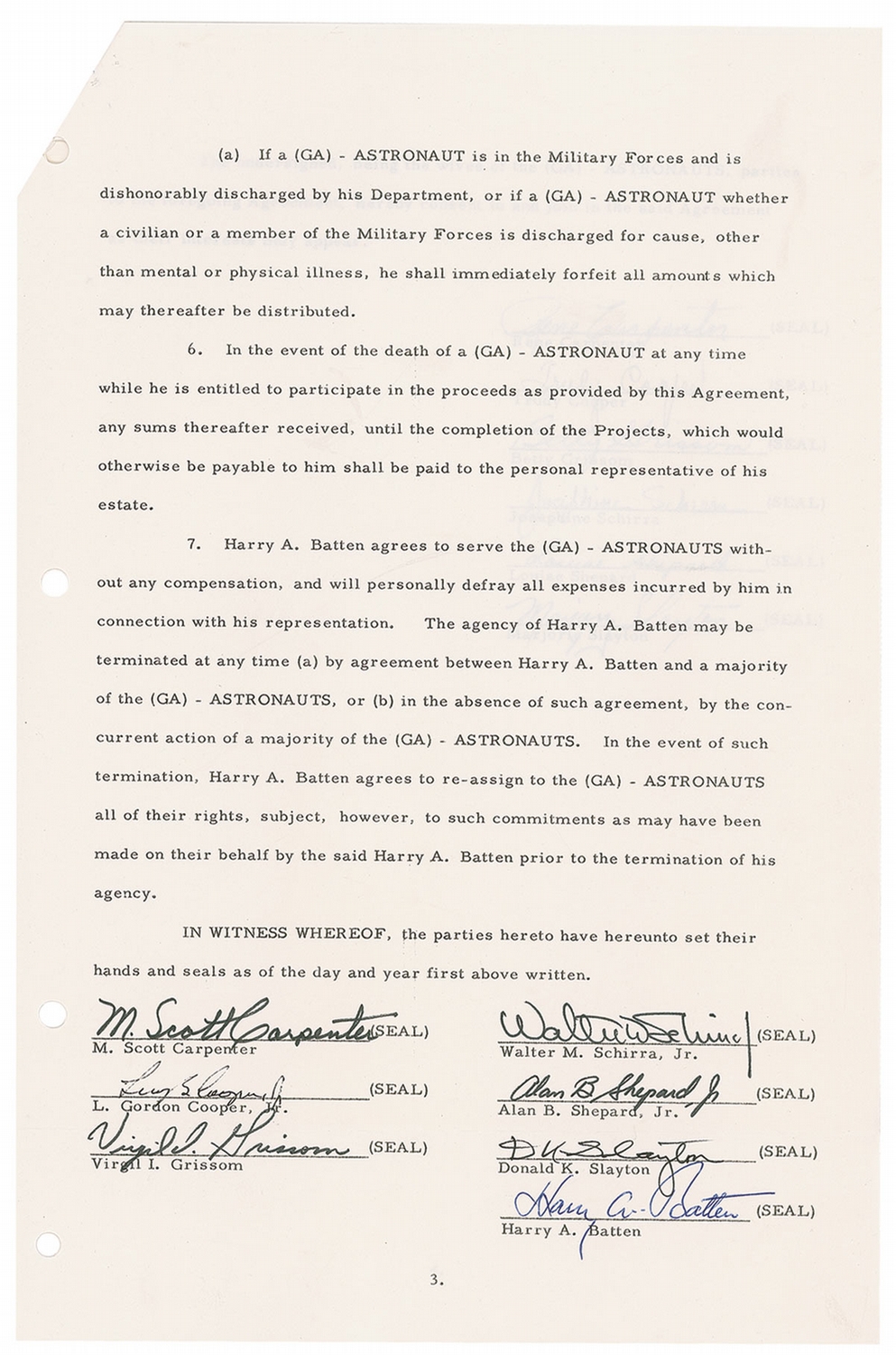 DS, signed “M. Scott Carpenter,” “Leroy G. Cooper, Jr.,” “Virgil I. Grissom,” “Walter M. Schirra, Jr.,” “Alan B. Shepard, Jr.,” and “D. K. Slayton,” four pages, 8.5 x 13, October 8, 1965. Agreement between six of the Mercury Seven astronauts (John Glenn having received his own contract) in which they elect to have Harry A. Batten represent them as their agent. In part: “Whereas the above named…Astronauts have been selected to train for participation in Projects Gemini, Apollo and other Space Flight Projects of the National Aeronautics and Space Administration (hereinafter referred to as NASA), and…[the] Astronauts and their families have valuable rights to stories of their personal experiences in connection with these Projects, including their personal stories of their space flights…[the] Astronauts have selected and hereby appoint Harry A. Batten to represent them in the sale of the rights they may have arising out of the projects.” Also signed by Batten and the wives of the six astronauts. Horizontal filing fold at the bottom of each page, four punch holes along the left side, paperclip impressions at the top edge, and a staple and staple holes at the top left corner, otherwise fine condition. An amazing document in which six of the original astronauts—including Grissom—agree to tell their life stories!