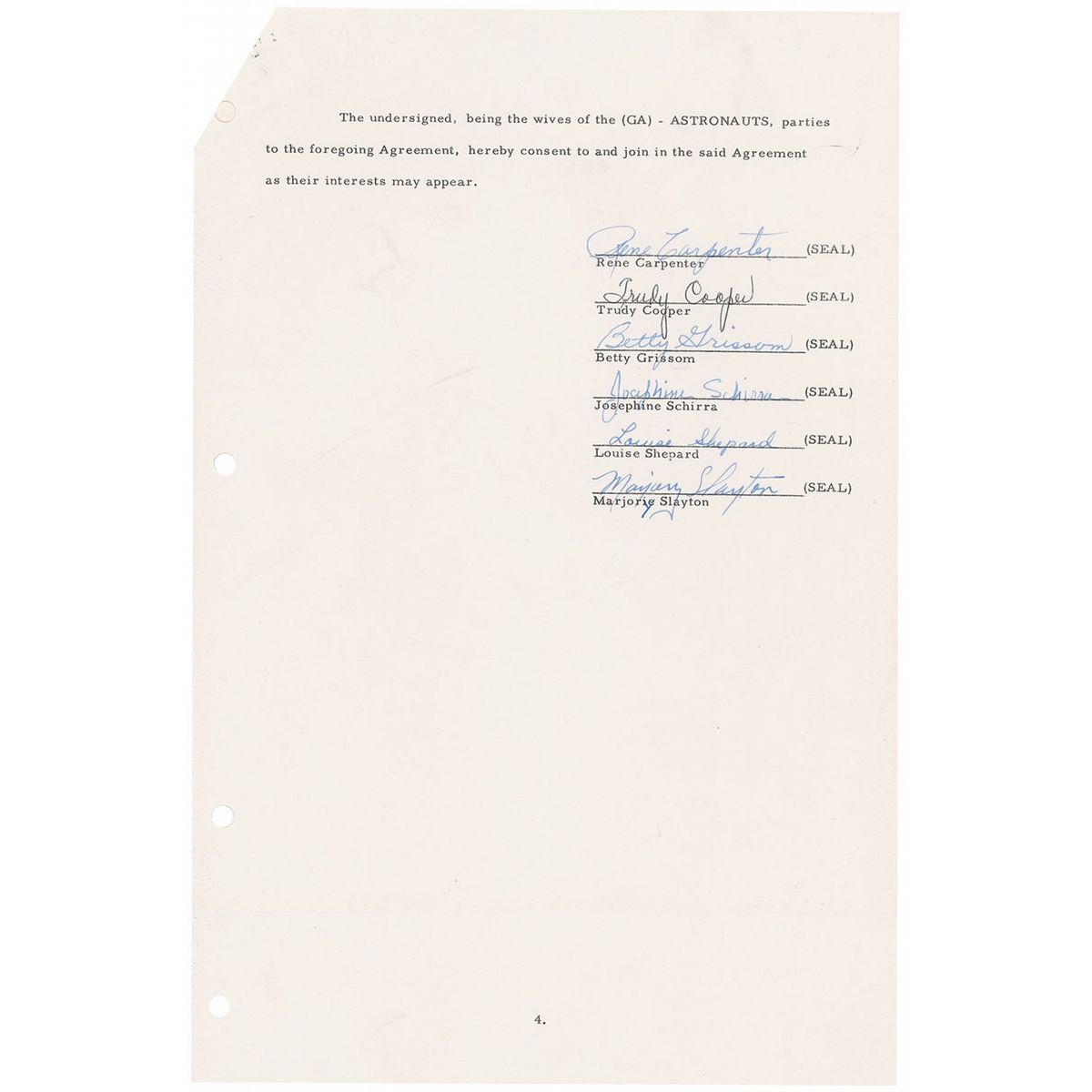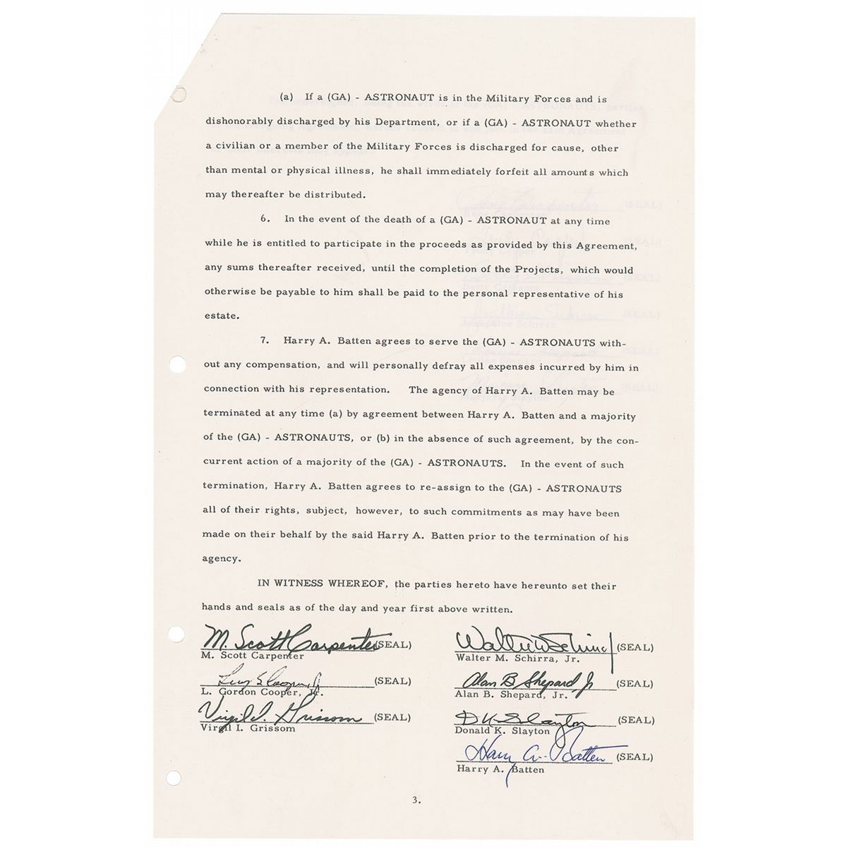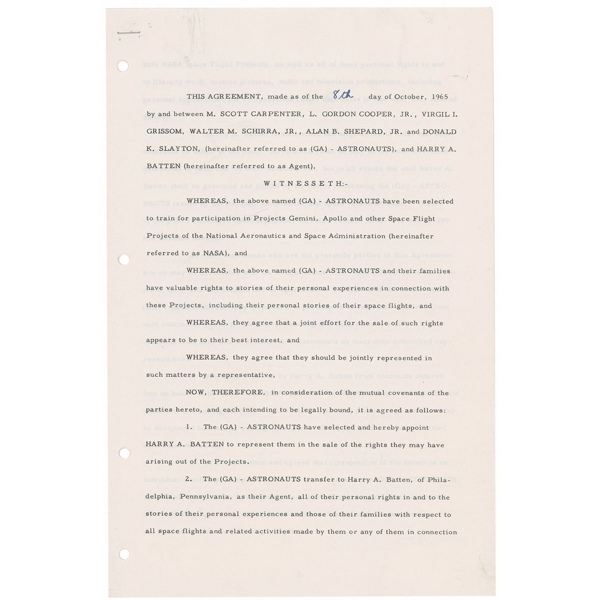 DS, signed “M. Scott Carpenter,” “Leroy G. Cooper, Jr.,” “Virgil I. Grissom,” “Walter M. Schirra, Jr.,” “Alan B. Shepard, Jr.,” and “D. K. Slayton,” four pages, 8.5 x 13, October 8, 1965. Agreement between six of the Mercury Seven astronauts (John Glenn having received his own contract) in which they elect to have Harry A. Batten represent them as their agent. In part: “Whereas the above named…Astronauts have been selected to train for participation in Projects Gemini, Apollo and other Space Flight Projects of the National Aeronautics and Space Administration (hereinafter referred to as NASA), and…[the] Astronauts and their families have valuable rights to stories of their personal experiences in connection with these Projects, including their personal stories of their space flights…[the] Astronauts have selected and hereby appoint Harry A. Batten to represent them in the sale of the rights they may have arising out of the projects.” Also signed by Batten and the wives of the six astronauts. Horizontal filing fold at the bottom of each page, four punch holes along the left side, paperclip impressions at the top edge, and a staple and staple holes at the top left corner, otherwise fine condition. An amazing document in which six of the original astronauts—including Grissom—agree to tell their life stories!