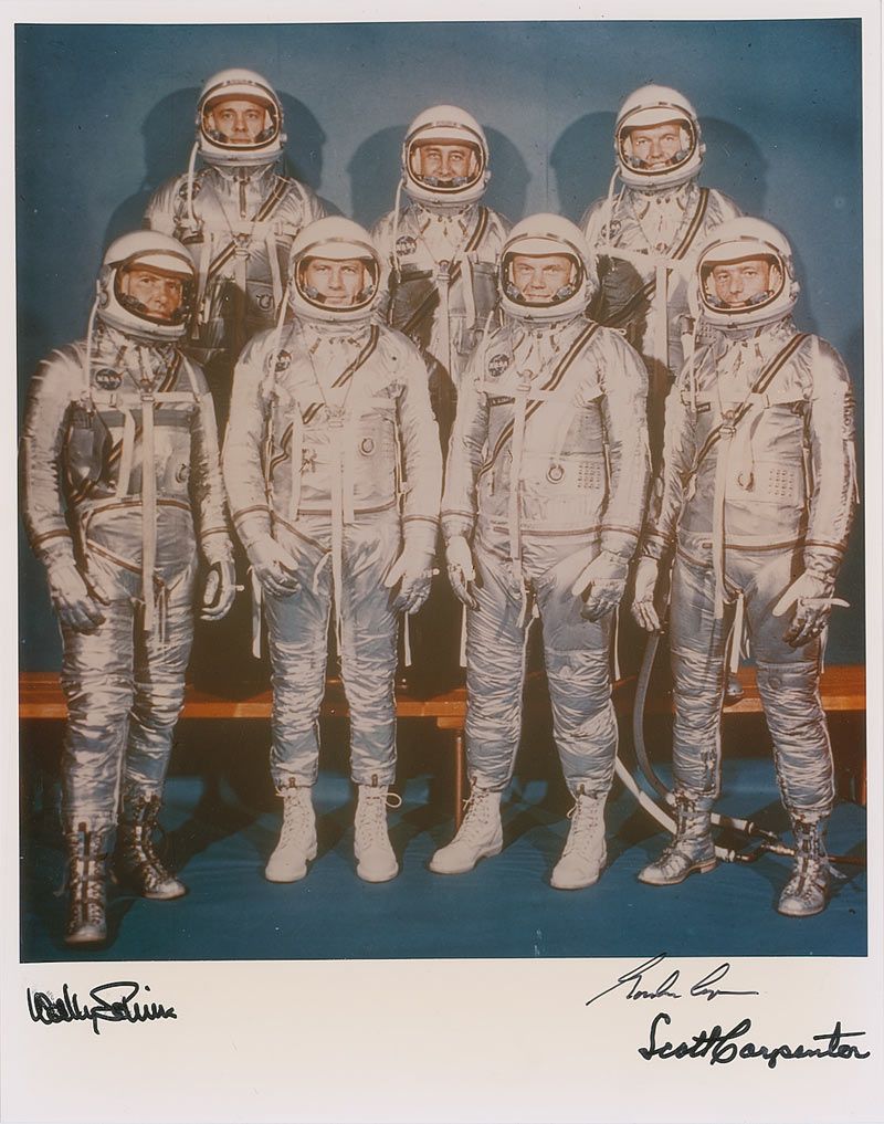 Color glossy 8 x 10 photo of the Mercury 7 astronauts posing in their spacesuits, signed in the lower border in black felt tip by Gordon Cooper, Wally Schirra, and Scott Carpenter. In fine condition, with a couple trivial bends.