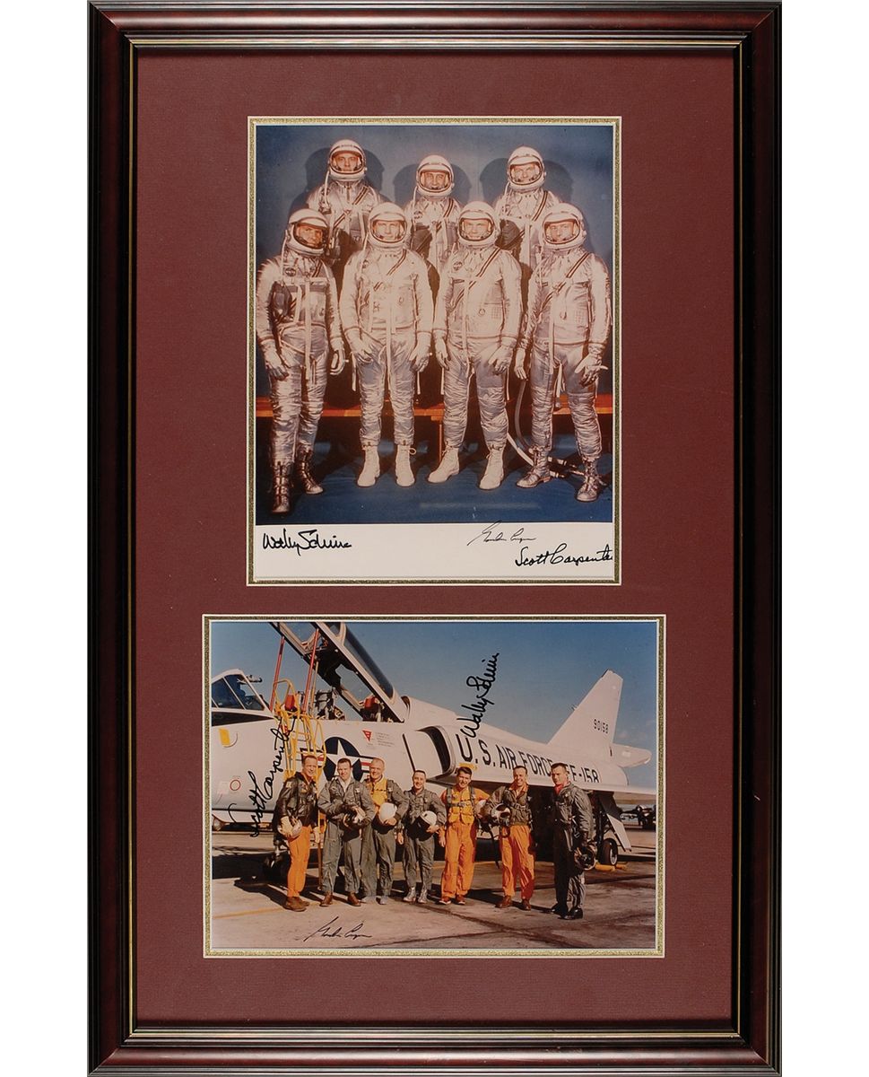 Color glossy 8 x 10 photo of the Mercury astronauts posing in their space suits, signed in the lower border in black felt tip by Wally Schirra, Gordon Cooper, and Scott Carpenter; and a color glossy 10 x 8 photo of the astronauts posing in front of a fighter jet, also signed in black felt tip by Cooper, Carpenter, and Schirra. Both are double matted and framed together to an overall size of 14.75 x 23. In fine condition.