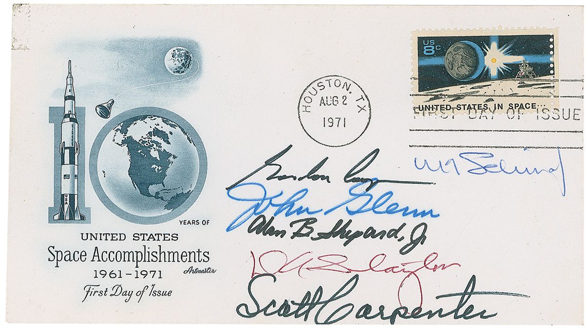 FDC with a cachet honoring a decade of space achievement, signed in ballpoint and felt tip by Gordon Cooper, John Glenn, Deke Slayton, Scott Carpenter, and Wally Schirra. Cover also bears an autopen signature of Alan Shepard. In fine condition, with a light vertical bend.