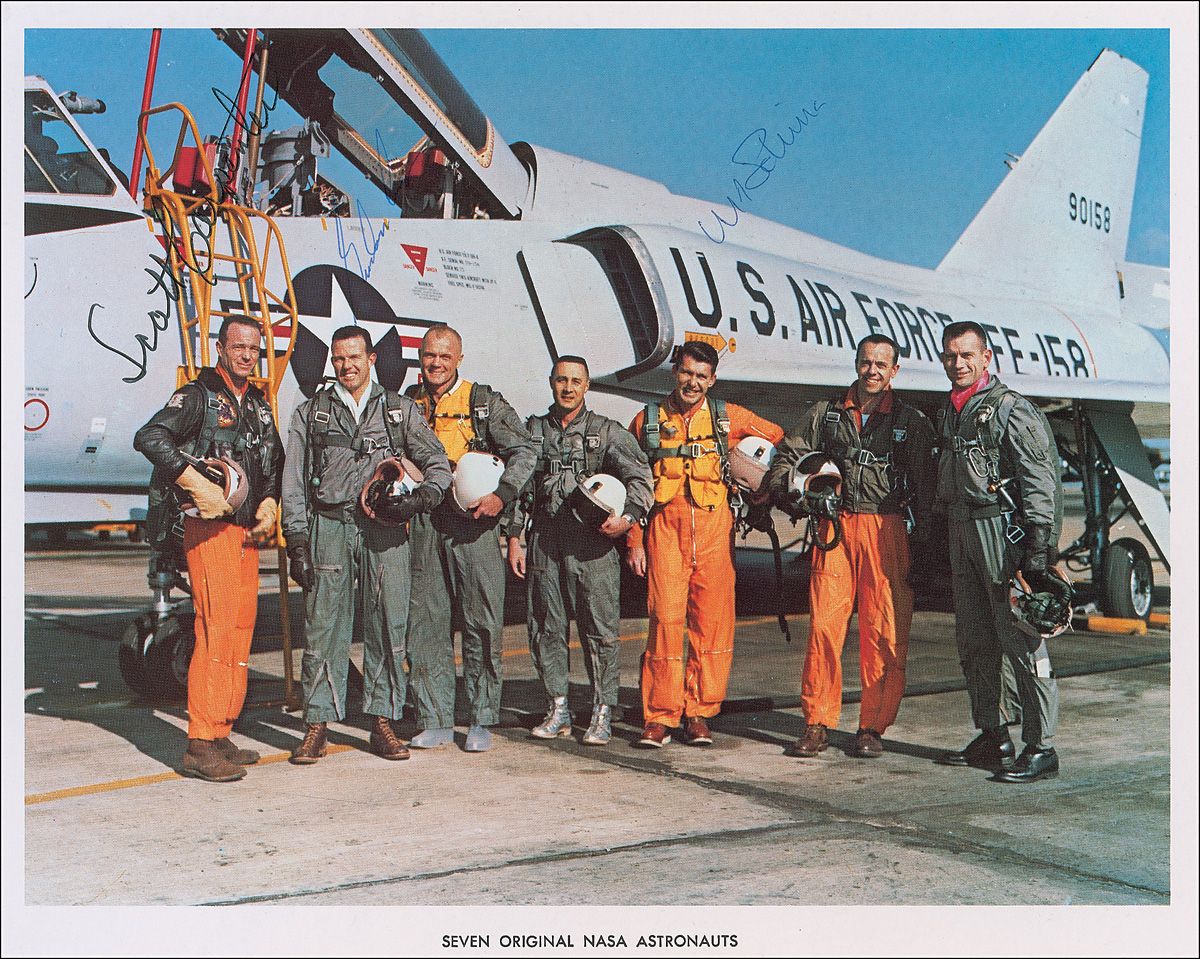 Color 10 x 8 NASA photo of the Mercury astronauts posing in front of an Air Force jet, signed in blue ballpoint by Gordon Cooper and Wally Schirra and in black felt tip by Scott Carpenter. In fine condition, with some light contrast to portion of Cooper’s signature.