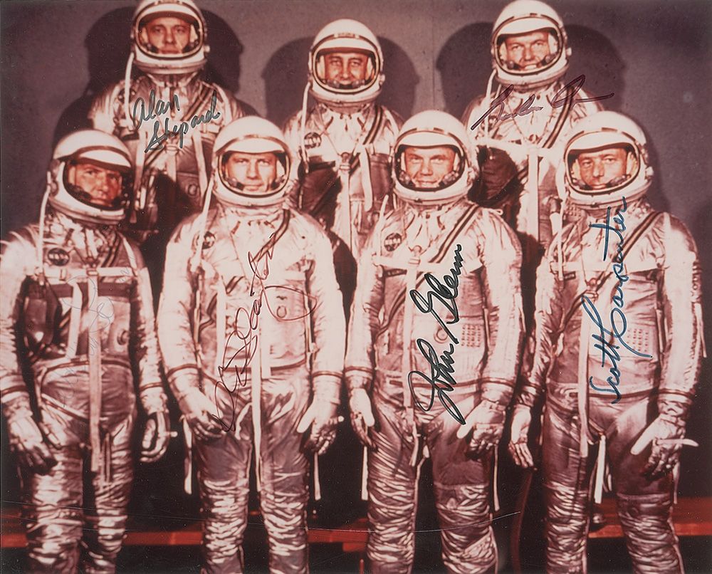 Color satin-finish 10 x 8 photo of the Mercury astronauts posing in their space suits, signed in blue and black felt tip by Alan Shepard, Gordon Cooper, Scott Carpenter, John Glenn, and Deke Slayton, and in blue ballpoint by Wally Schirra. Image a bit dark and heavy contrast to Schirra’s very light signature, otherwise fine condition. In 1986, the original owner had the image transferred from a set of GAF Pana-vue educational slides titled 'A Step Into the Universe,” and printed on Fuji photo paper. Later that same year, the six living Mercury 7 astronaut’s signatures (not including Gus Grissom, who had perished in the Apollo 1 fire) were procured through the mail.