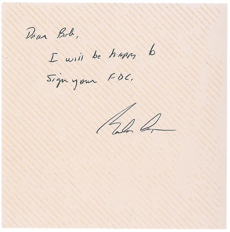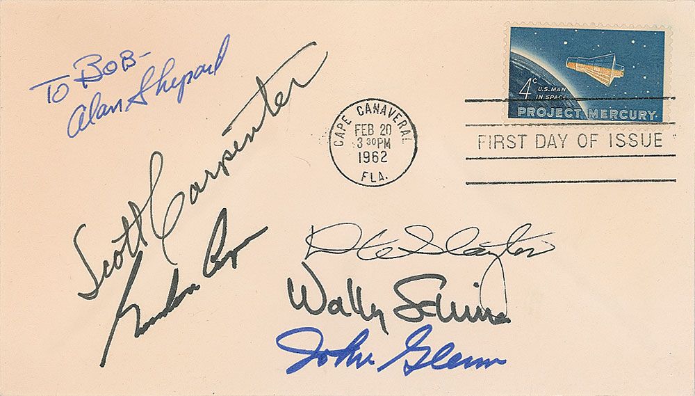 FDC bearing a February 20, 1962 (John Glenn’s launch date), Cape Canaveral postmark, signed on the front in ink and felt tip by John Glenn, Wally Schirra, Deke Slayton, Gordon Cooper, Scott Carpenter, and Alan Shepard, who has inscribed it “To Bob.” In fine condition. Accompanied by an ANS from Gordon Cooper which reads, “I will be happy to sign your FDC.”