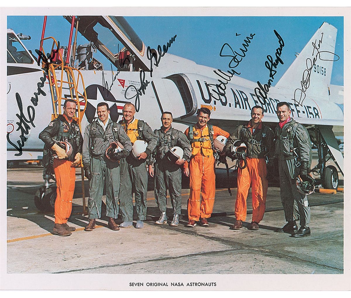 Desirable color 10 x 8 NASA photo of the seven original Mercury astronauts in flight gear, signed vertically in black felt tip by Scott Carpenter, Gordon Cooper, John Glenn, Wally Schirra, Alan Shepard, and Deke Slayton, each signing above his image. In fine condition.
