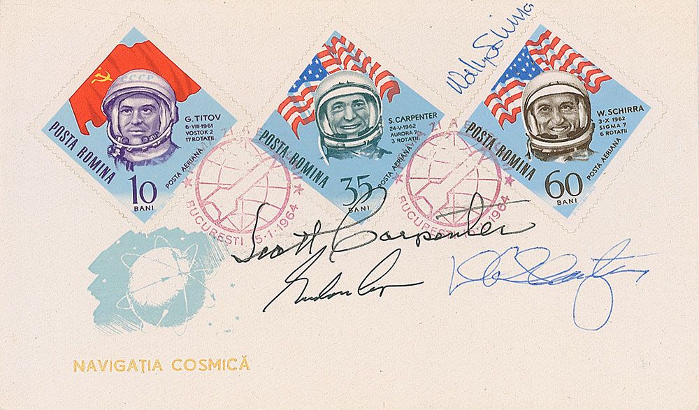 Philatelic souvenir, 6.5 x 3.75, with three commemorative Russian postal stamps honoring Gherman Titov, Scott Carpenter, and Wally Schirra, and bearing two 1964 postal cancellations, signed in blue and black ink by Scott Carpenter, Gordon Cooper, Deke Slayton, and Wally Schirra. In fine condition.