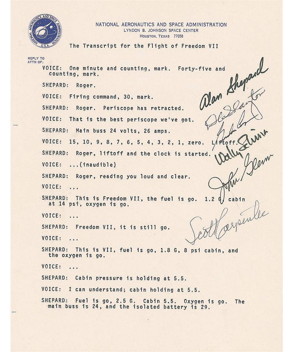 A printed typescript of Shepard’s historic flight in space, signed by six of the Mercury Astronauts, 8 x 10.5, 6 pages, no date, NASA letterhead. Entitled ‘The Transcript for the Flight of Freedom VII,’ the typescript is a record of what was said between Shepard and Earth, including the launch (“the clock is started”), splashdown and recovery (“Astronaut now on board”). Signed on the first page in ink and felt tip by Alan Shepard, D. K. Slayton, John Glenn, Gordon Cooper, Wally Schirra, and Scott Carpenter. In fine condition.