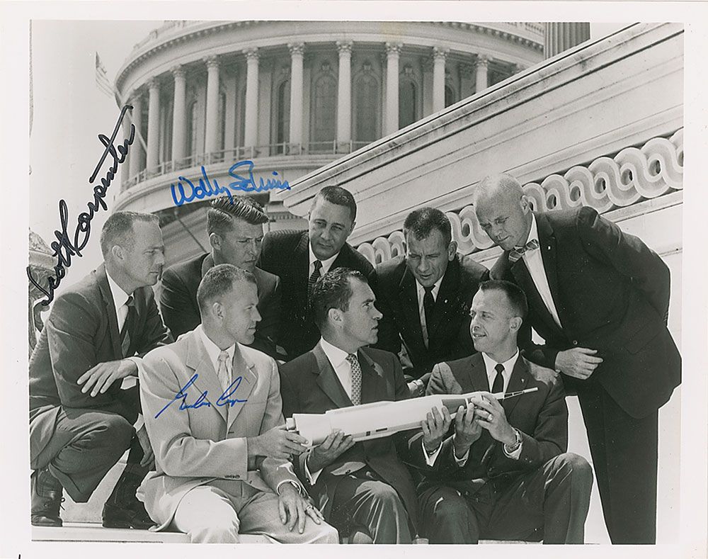 Glossy 10 x 8 photo of the Mercury astronauts and Richard Nixon on the Capital steps, signed in blue and black felt tip by Scott Carpenter, Wally Schirra, and Gordon Cooper. In fine condition.