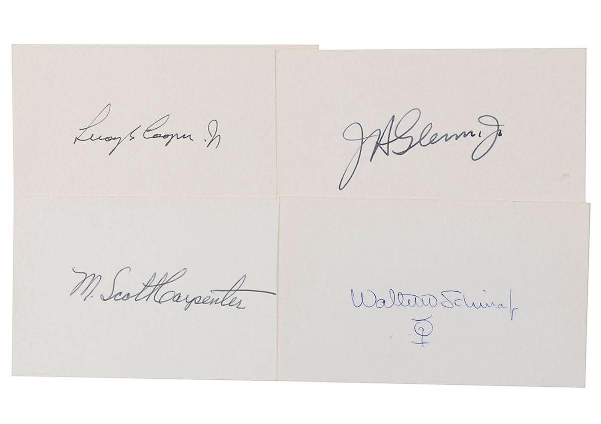 Vintage ink and ballpoint signatures, “J. H. Glenn, Jr. ,” “Leroy G. Cooper, Jr.,” “M. Scott Carpenter,” and “Walter M. Schirra, Jr.” (adding a Mercury symbol under his signature), on individual off-white 5 x 3 cards. In fine condition.