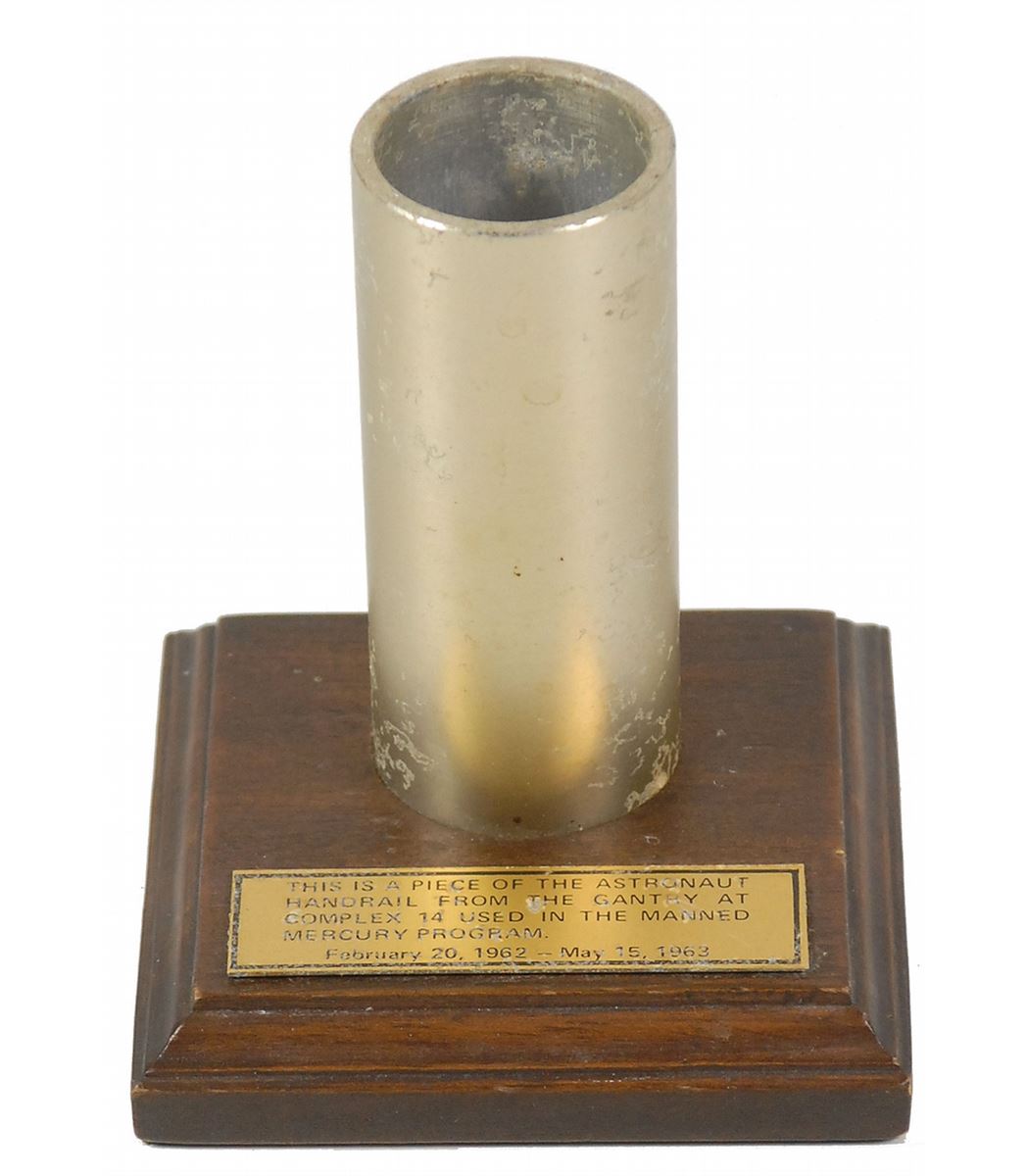 A 3.75? tall section of handrail from the gantry handrail of Complex 14. Rail is attached to a 4 x 4 wooden base with an engraved plaque that reads, “This is a piece of the astronaut handrail from the gantry at Complex 14 used in the manned Mercury program. February 20, 1962–May 15, 1963.” In fine condition, with expected moderate wear and dings. Rail originates from the collection of Gerald Gurian.
