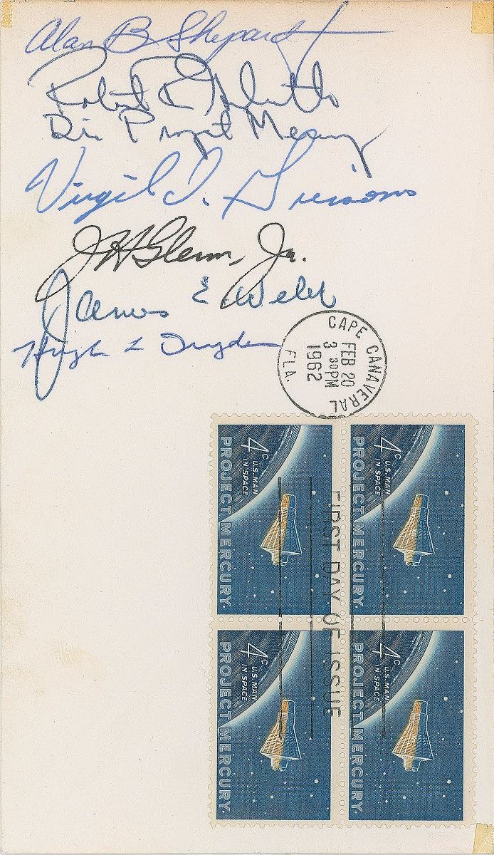 FDC honoring Project Mercury, signed in ink by three astronauts, “Virgil I. Grissom,” “Alan B. Shepard, Jr.,” and “J. H. Glenn, Jr.,” as well as NASA administrators Robert Gilruth, Hugh Dryden, and James E. Webb. In fine condition, with toned tape at top corner tips. Accompanied by a full letter of authenticity from PSA/DNA.