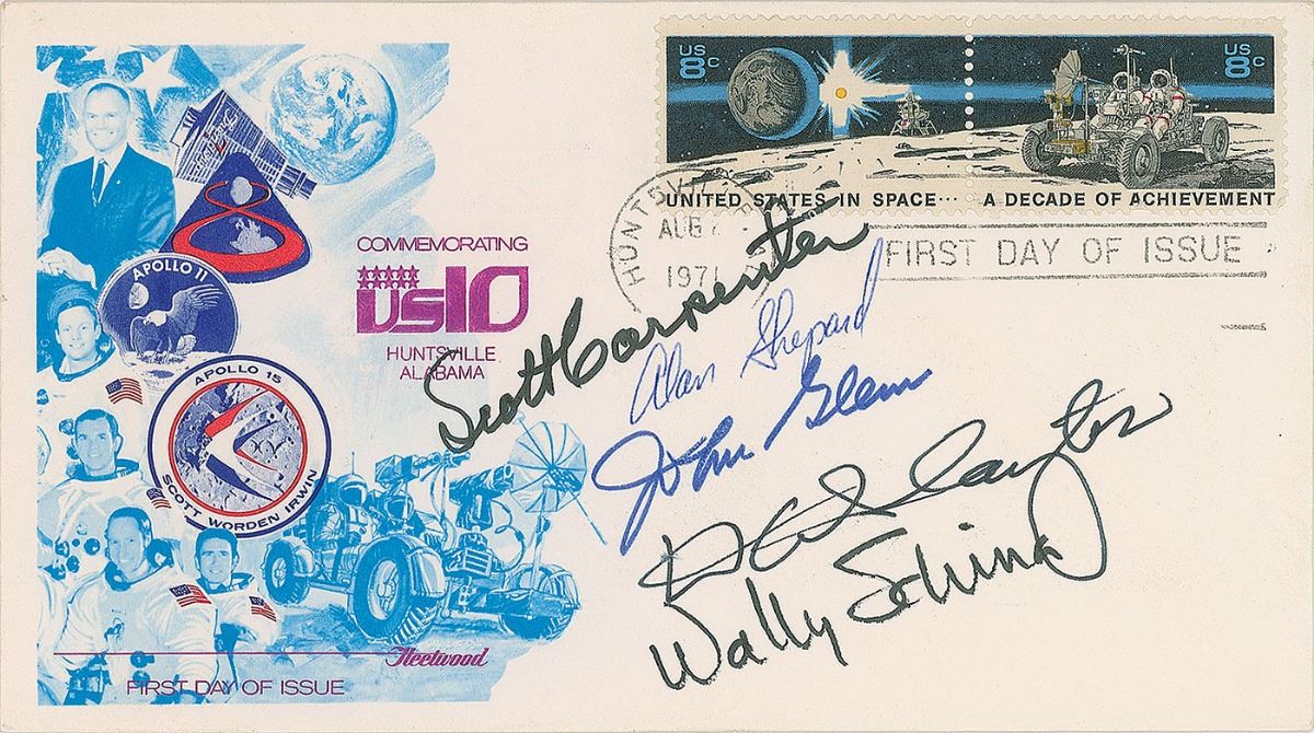 Uncommon FDC with a cachet honoring US10 Huntsville, Alabama, signed in black felt tip by Scott Carpenter, Deke Slayton, and Wally Schirra, in blue felt tip by John Glenn, and in blue ballpoint by Alan Shepard. In fine condition.