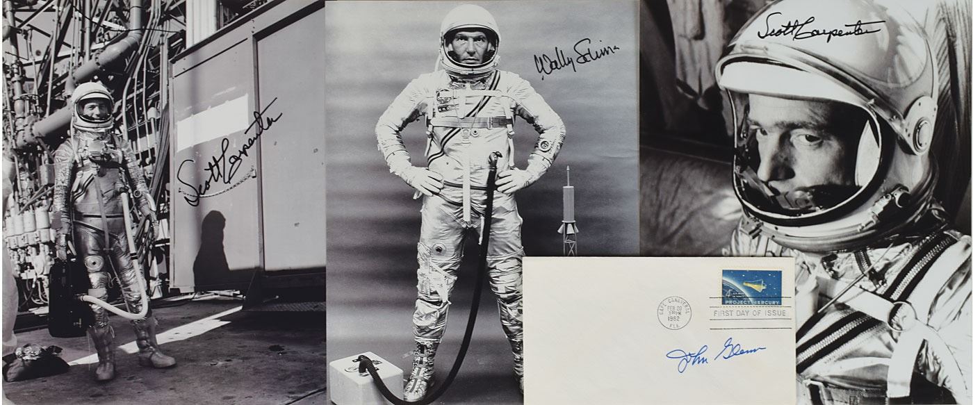 Four items: an FDC postmarked February 20, 1962, the launch day of the Friendship 7 spacecraft, signed in blue felt tip by John Glenn; and three semi-glossy 8 x 10 photos, two signed in black felt tip by Scott Carpenter, and one signed in black felt tip by Wally Schirra. In overall fine to very fine condition.
