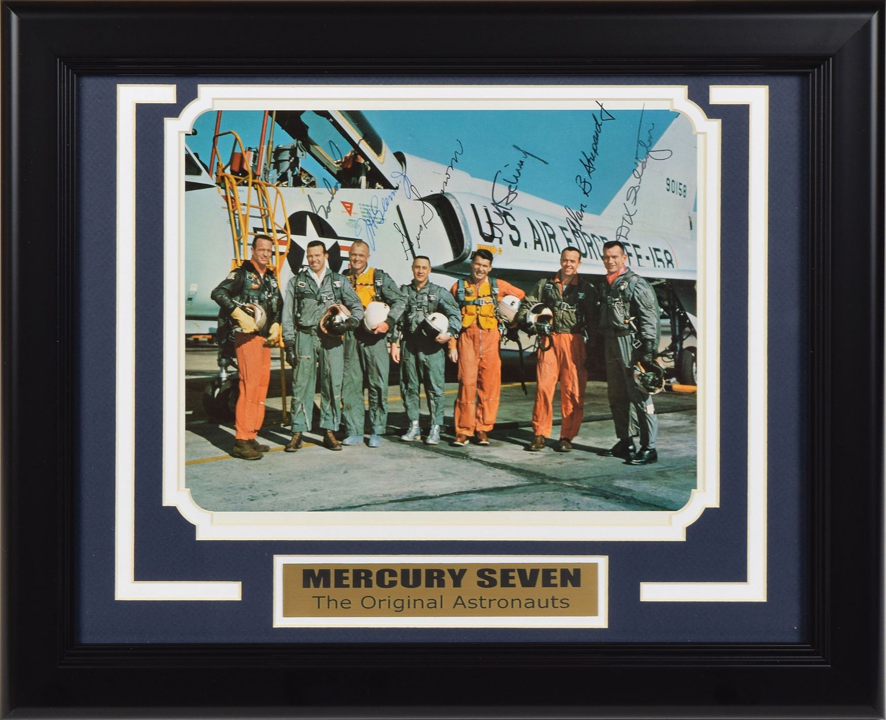 Official color 9.75 x 7.75 NASA lithograph of the original Mercury astronauts posing in front of a Convair F106-B aircraft at Langley Air Force Base on January 20, 1961, signed over their respective images in ink or felt tip, "Gordon Cooper," "J. H. Glenn, Jr.," "Gus Grissom," "W. M. Schirra, Jr.," and "DK Slayton." Also bears a secretarial signature of Al Shepard. Handsomely double-matted and framed with an engraved plaque to an overall size of 16.5 x 13.5. In fine condition.