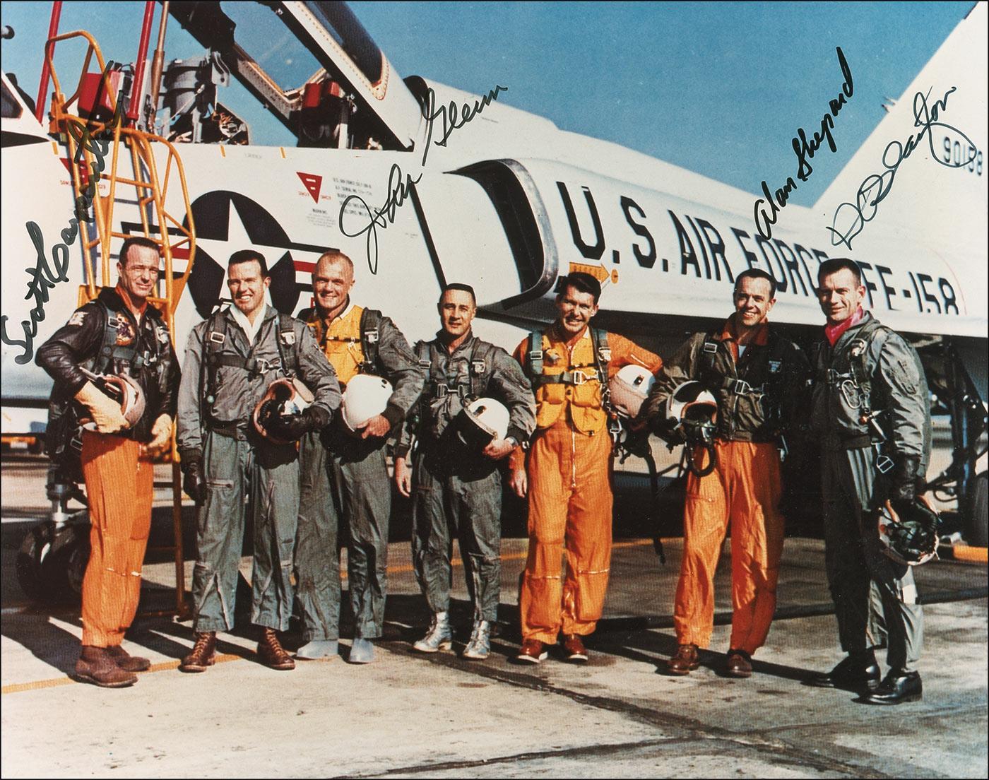 Color satin-finish 10 x 8 photo of all seven Mercury astronauts in their flight suits posing in front of an F-102, signed in black felt tip by Scott Carpenter, John Glenn, Alan Shepard, and Deke Slayton. In very fine condition. Pre-certified Scott Cornish and RRAuction COA.