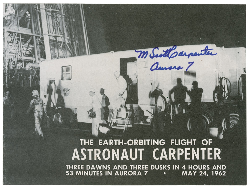 Mission booklet entitled “The Earth-Orbiting Flight of Astronaut Carpenter,” 10.25 x 7.5, signed on the front cover in blue felt tip, “M. Scott Carpenter, Aurora 7.” In fine condition.