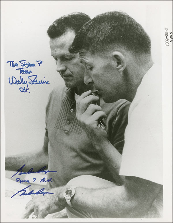 Vintage glossy 8 x 10 NASA photo of Schirra and Cooper reviewing some data, signed in blue felt tip “The Sigma 7 Team, Wally Schirra Cdr.” and “Gordon Cooper, Sigma 7 B. U.” again signing “Gordon Cooper.” In fine condition, with a couple small surface marks and bends.