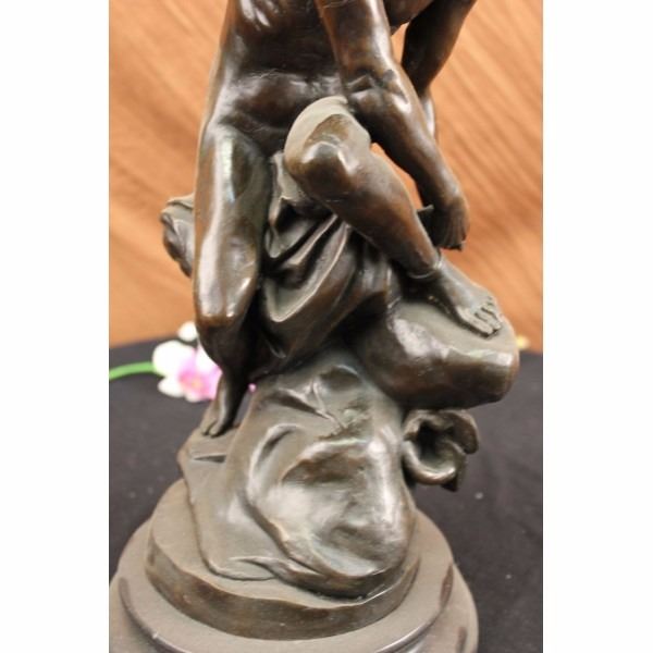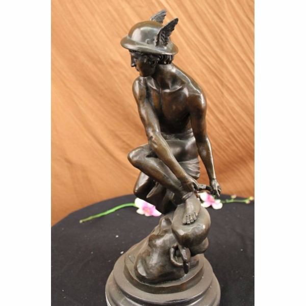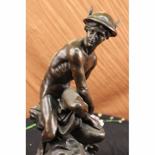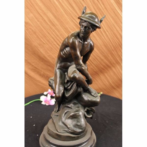 This Is A Bronze Rendition Of Roman Mythological God Mercury. Mercury Is Seen Seated Among The Billows Of Clouds Hurriedly Preparing Himself For His Celestial Duty. The Beholder Witnesses Him Tying His Divine Gear To Complete His Charge Of Delivering Messages From The Gods, In Swift Flights, To And Fro From Earth And To The Heavens. He Wears The Typical Talaria Which Are Winged Sandals, Made By The God Haphaestus, Made Of Imperishable Gold In Which Allows The God To Fly As Prompt As Any Bird. A Petasos Crowns His Head Which Is A Sun Hat Of Thessalian Origin Worn By The Ancient Greeks. As A Winged Hat, It Became The Symbol Of Mercury Or His Greek Correlative God, Hermes. Mercury Is Also Considered The God Of Commerce, Cunning, And Invention. He Was Cast Using The Ancient Method Of Lost-Wax Casting And Stained With A Brown Patina Finish For Perpetuation. The Sculpture Is Mounted Upon A Black Marble Base With The Artist Giambologna'S Signature. Giambologna, Born As Jean Boulogne, Incorrectly Known As Giovanni Da Bologna And Giovanni Bologna (1529 – 13 August 1608), Was A Sculptor, Known For His Marble And Bronze Statuary In A Late Renaissance Or Mannerist Style. Giambologna Was Born In Douai, Flanders (Now In France). After Youthful Studies In Antwerp With The Architect-Sculptor Jacques Du Broeucq,He Moved To Italy In 1550, And Studied In Rome. Giambologna Made Detailed Study Of The Sculpture Of Classical Antiquity. He Was Also Much Influenced By Michelangelo, But Developed His Own Mannerist Style, With Perhaps Less Emphasis On Emotion And More Emphasis On Refined Surfaces, Cool Elegance And Beauty. Bronze Dimensions With Marble Base: Height 19 X Width 8 inches. Weight: 25Lbs.