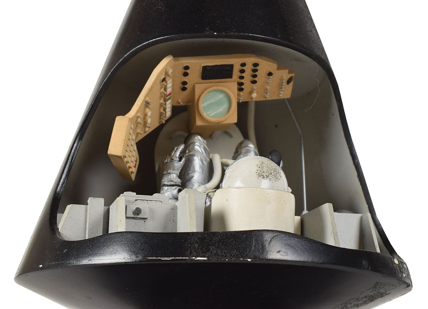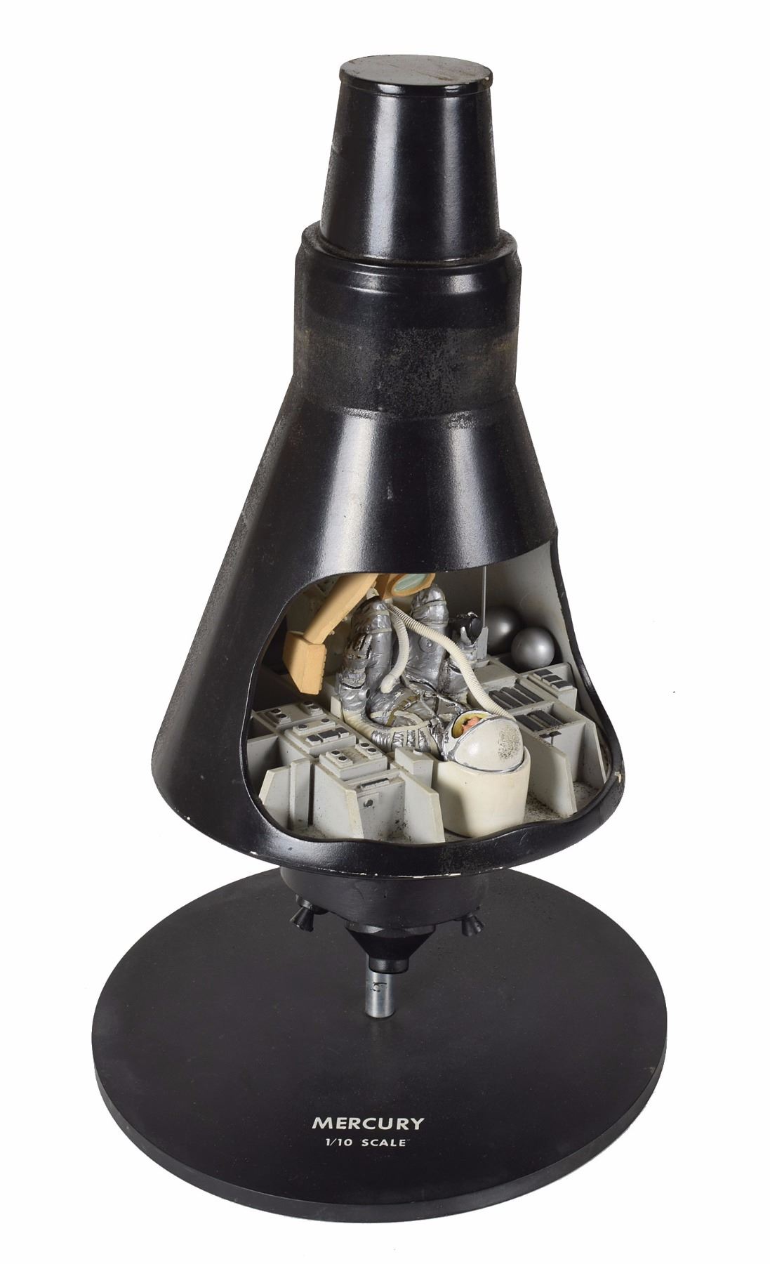 Fantastic 1:10 scale model of a Project Mercury capsule, used by NASA as part of an outreach program during the late 1960s and early 1970s. The black model measures approximately 17? tall and depicts a Mercury astronaut seated inside the capsule with various instrument panels. The capsule is set upon a 10? diameter metallic base, and includes its original wooden 12 x 18.5 x 12 storage box. The top of the box features white stenciling, "Mercury 1/10 scale," a felt tip notation, "M8/18," and a NASA 'meatball' logo sticker, as well as a faded shipping label; top carrying handle bears the original green tag. In very good to fine condition, with expected wear from use and storage, including: light scuffing to capsule exterior and astronaut helmet; the lower legs of the astronaut are detached but present (old model glue on limbs indicate a previous attempt to fix), and the support foam material inside storage box disintegrating.