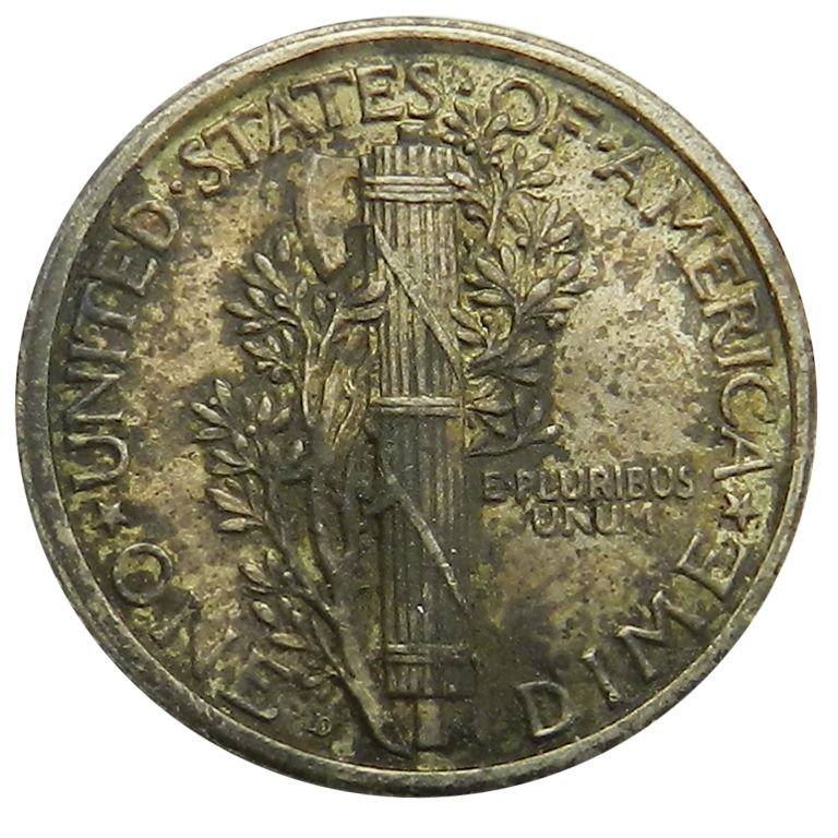 Mercury Dime, 1920-D. Deeply toned Unc, trace verdigris, full bands. A good candidate for conservation at NCS.