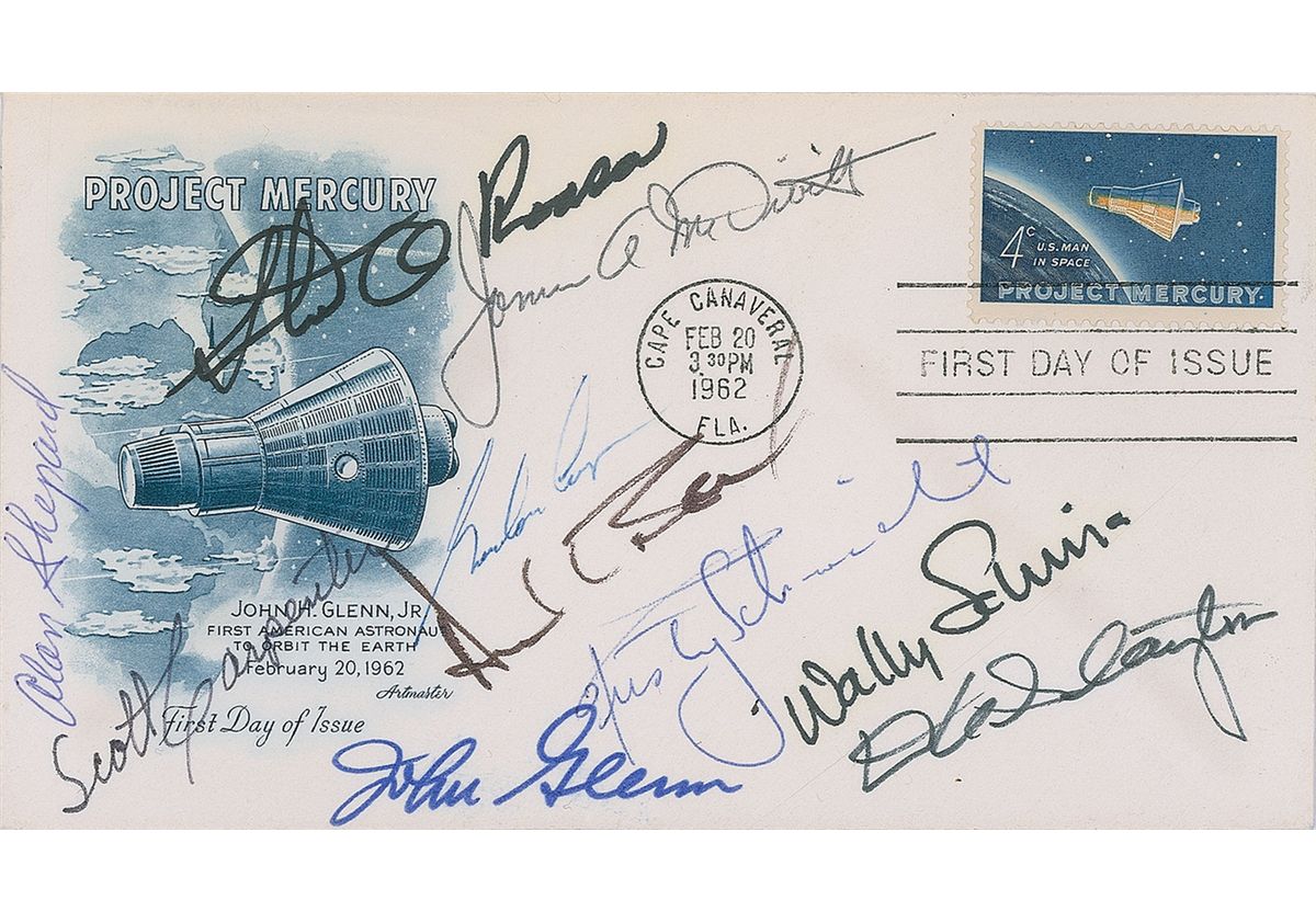 FDC with a cachet honoring Project Mercury, signed in felt tip and ballpoint by ten astronauts from the Mercury, Gemini, and Apollo programs: Alan Shepard, Scott Carpenter, Alan Bean, Gordon Cooper, John Glenn, Deke Slayton, James McDivitt, Wally Schirra, Rusty Schweickart, and Stuart Roosa. In fine condition.
