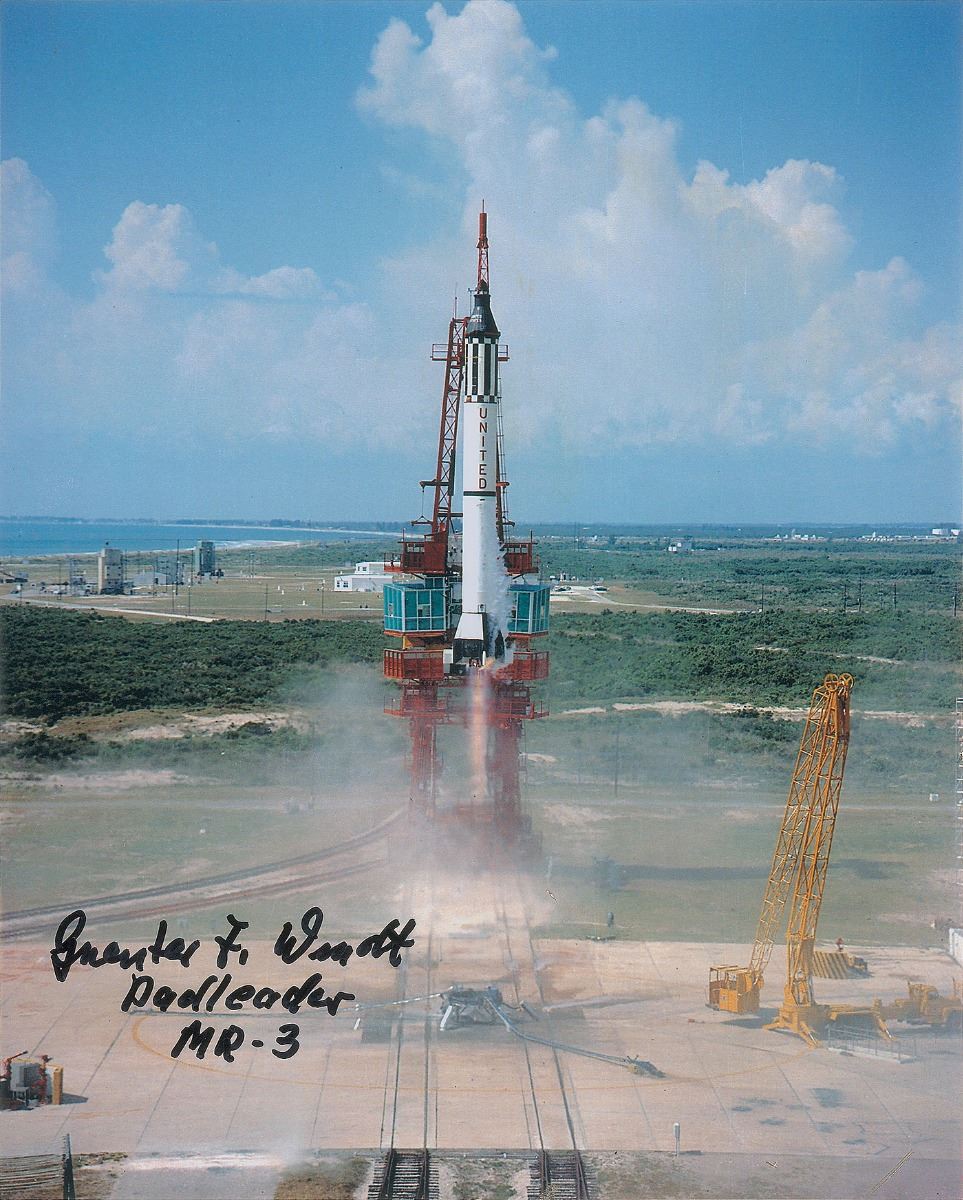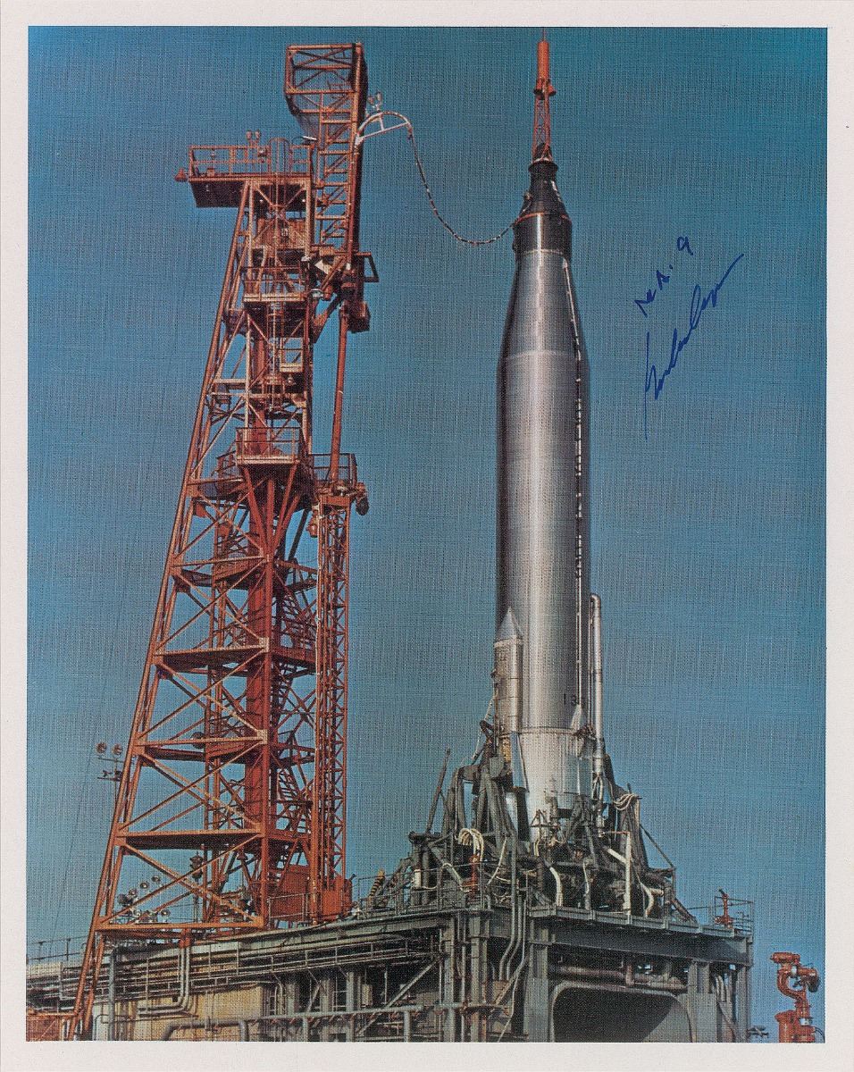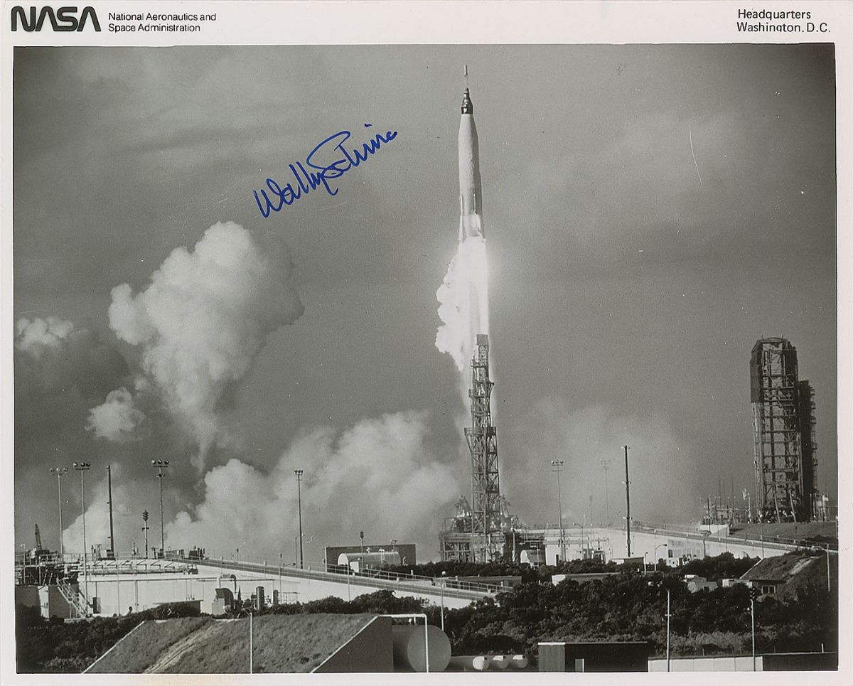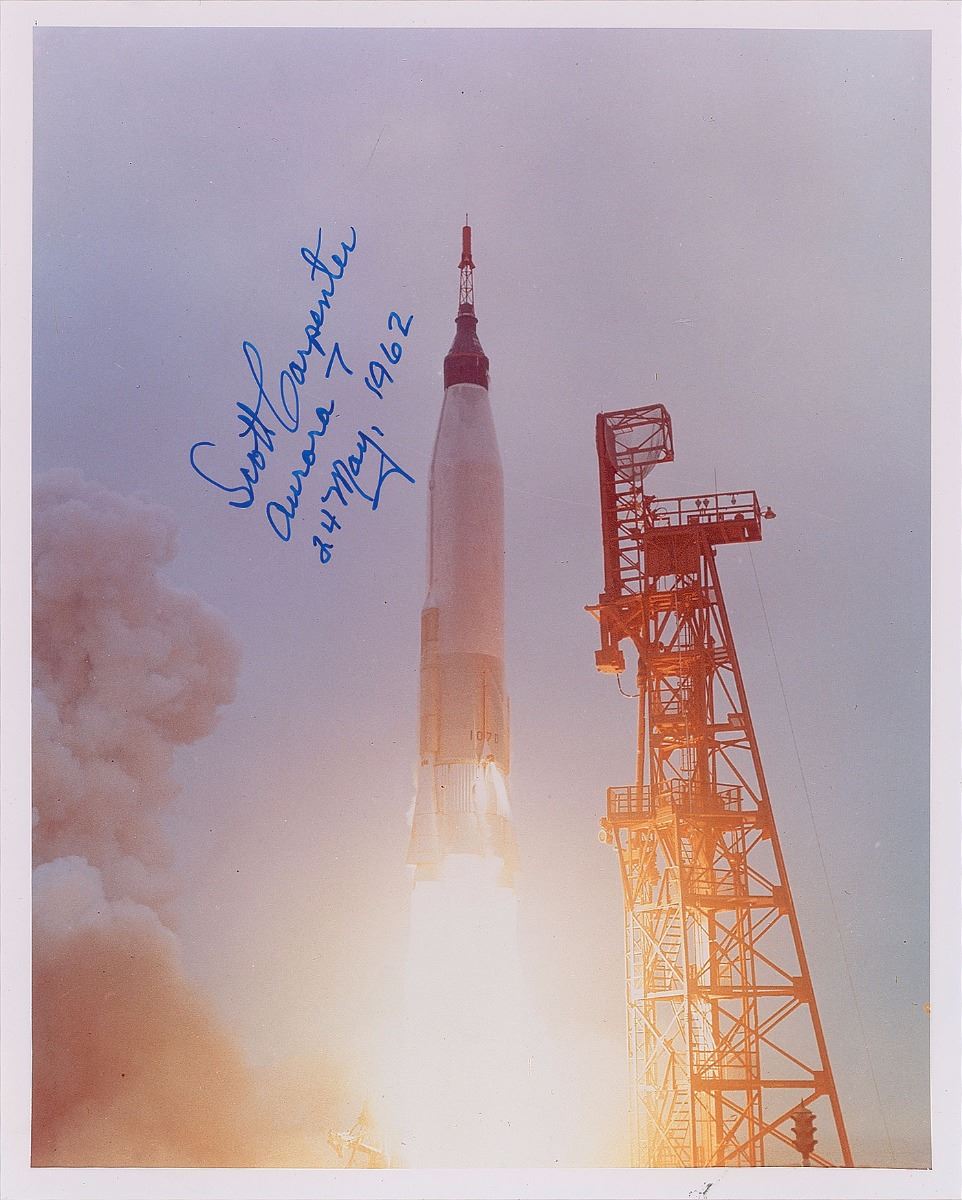 Four photos: a color glossy 8 x 10 photo of a launching Saturn rocket, signed in blue felt tip, “Scott Carpenter, Aurora 7, 24 May, 1962”; an official glossy 10 x 8 photo of the Sigma 7 launch, signed in blue felt tip, “Wally Schirra”; a color semi-glossy 8 x 10 photo of the Faith 7 prior to launch, signed in blue felt tip, “MA-9, Gordon Cooper”; and a color satin-finish 8 x 10 photo of the Freedom 7 liftoff, signed in black felt tip, “Guenter F. Wendt, Padleader, MR-3.” In overall fine condition.