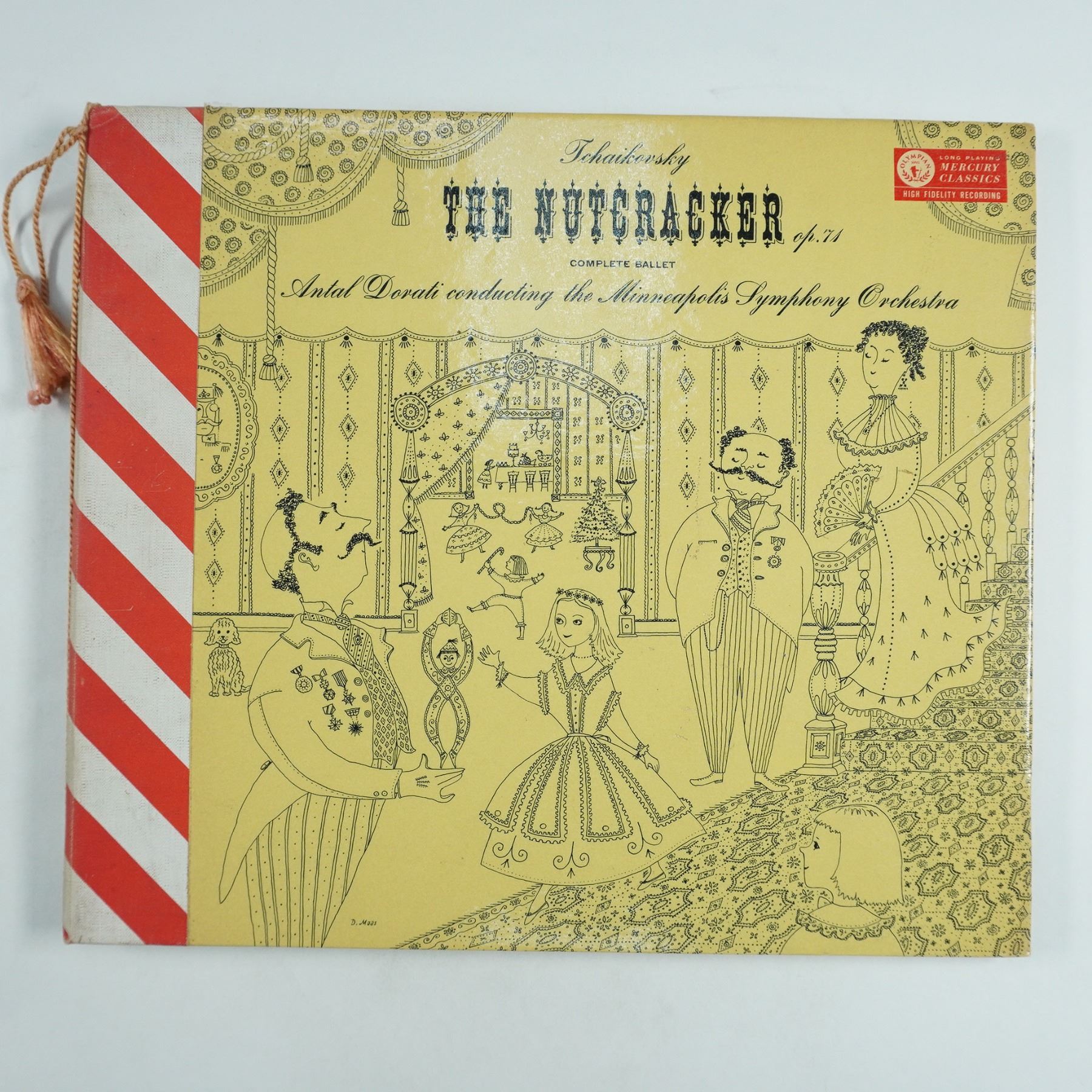 Mercury Living Presence LP box set featuring Tchaikovsky's The Nutcracker Ballet, Op. 71, conducted by Antal Dorati with the Minneapolis Symphony Orchestra. This collectible edition includes a detailed booklet with illustrated notes on the ballet and its story. The box features an eye-catching red and gold striped design with a pull-string closure. Mercury Living Presence was renowned for its high-fidelity recordings, making this a sought-after release for collectors and classical music enthusiasts.