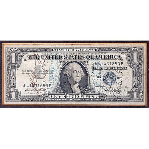 <Our item number 138589><B>Mercury Program, 1961, $1 "Short Snorter".</B> (Series 1957) During one of the many "gatherings of the guys" in Cocoa Beach, FL during Project Mercury, the astronauts signed a "short snorter" dollar bill for the consignor. <BR>The Short Snorter tradition, established in WW II, provided that all those involved in the signing of each other's bills, must carry the bill in their wallet. If challenged later, the person unable to produce the short snorter had to pick up the tab (drinks) for all present.<BR>This bill is signed by John Glenn, Wally Schirra, Virgil Grissom, Leroy Cooper, Deke Slayton (Mercury astronauts) as well as Charles Conrad, John Young, Al Worden (Apollo astronauts) and Bill Lyon (a press associate of the consignor's). <BR>This bill is somewhat wrinkled and the autographs faded as you would expect under the circumstances, but it is a great example of the early comradery among the astronauts and their constant attempts to relieve the pressure under which they operated day in and day out. The bill is in what looks to be its original mat and frame. Attractive and quite scarce. <BR>Estimated Value $750 - 1,000. <I><BR>Ex. the comedian Bill Dana/Jose Jimenez collection.</I> <BR><BR>Our item number 138589<BR><IMAGES><P ALIGN="CENTER"><IMG SRC="http://www.goldbergcoins.net/liveauction/49jpegs/138589.jpg"> </P></IMAGES>