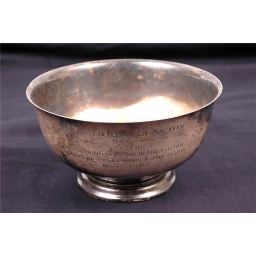 <Our item number 130100><B>Mercury Program, 1962, Sterling Silver Presentation Bowl.</B> (6.5x4", 438.3 grams = about $275 as silver alone) This Gorham sterling silver bowl was presented to "Donald Kent Slayton / Major / in Recognition and in Gratitude / Magazine Publisher's Association, May 1962". We're not exactly sure what he did to be presented this bowl this early in his NASA career, but it is an attractive addition to any collection. Tarnished but in excellent condition. Unique. <BR>Estimated Value $350 - 500. <I><BR>Ex. the Donald "Deke" Slayton Estate collection.</I> <BR><BR>Our item number 130100<BR><IMAGES><P ALIGN="CENTER"><IMG SRC="http://www.goldbergcoins.net/liveauction/49jpegs/130100.jpg"> </P></IMAGES>