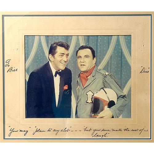 <Our item number 138579><B>Mercury Program, 1966, Dean Martin Comedy Hour Presentation Photo.</B> (8x10", professionally double matted and framed to 18x16") This unique color photo of Dean Martin and Bill Dana/Jose, the Reluctant Astronaut, is inscribed on the mat: "To Bill, You may 'plan to cry a lot'…but you sure make the rest of us laugh, Dino".<BR><BR>During the 1960's and 1970's, Bill was a favorite guest on all the major television comedy and variety shows including the Ed Sullivan Show, the Steve Allen Show, the Hollywood Palace and The Tonight Show, among others. This photo depicts an October 20, 1966 appearance of Bill, in his famed role as Jose the Astronaut, on the Dean Martin Show with the host, Dean Martin. For those of you too young to remember this time in history, you are looking at two of the kings of TV who, with their contemporaries, were "must watch" TV and who made the whole country laugh and forget their troubles. Extensive uniform toning o n the mats, but a unique memento of bygone times. <BR>Estimated Value $750 - 1,000. <I><BR>Ex. the comedian Bill Dana/Jose Jimenez collection.</I> <BR><BR>Our item number 138579<BR><IMAGES><P ALIGN="CENTER"><IMG SRC="http://www.goldbergcoins.net/liveauction/49jpegs/138579.jpg"> </P></IMAGES>