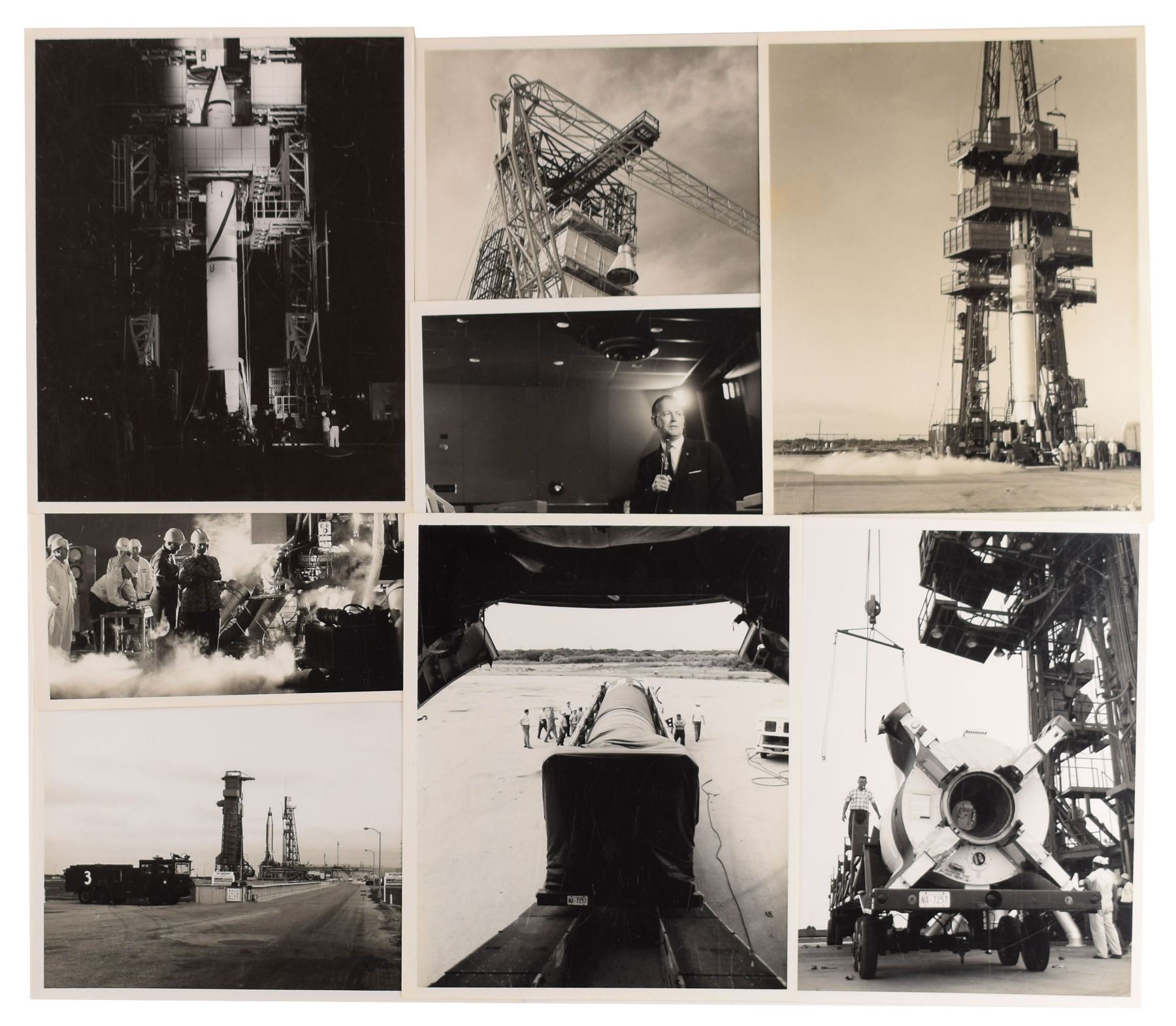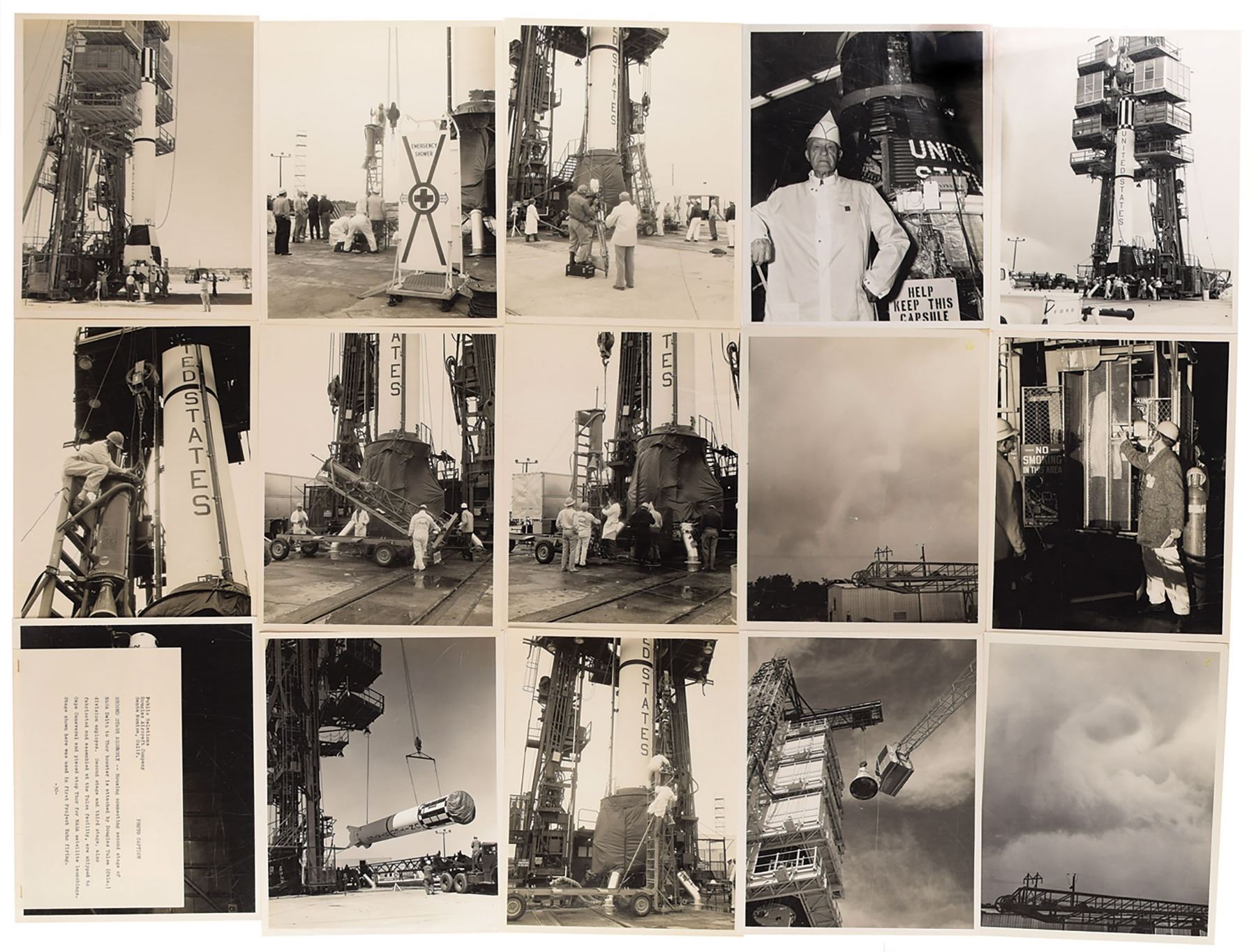 Unusual collection of over 70 vintage original NASA photographs documenting pre- and post-mission events during the Mercury Program, all glossy finished, 8 x 10 and 10 x 8, with the majority bearing NASA caption text on reverse; some photos feature caption sheets stapled to front of image. This photographic collection is quite diverse, with the following a mere sample of the included images: famed flight director Christopher Kraft during a press conference; spacecraft hardware readied for lift; an ABMA Redstone Missile; the MR-2 in launch structure and MR-4 capsule during transportation; numerous shots of the escape pylon tower; various NASA personnel and military figures; and several photos of pre-launch news conferences and ceremonies. In overall very good to fine condition, with some curling and edgewear.