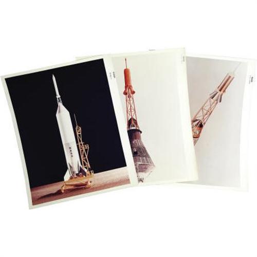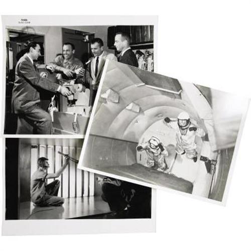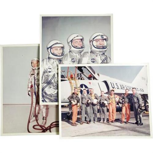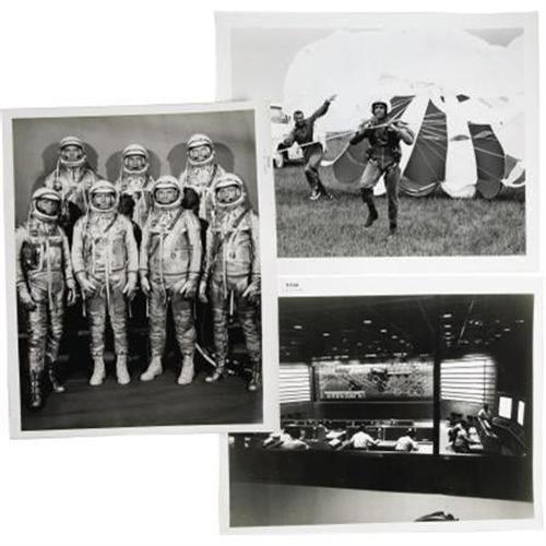 <B>Mercury Program - Group of 27 Original NASA Photographs.</B></I> An excellent vintage collection of both well-known and seldom-seen official NASA 8" x 10" (a few trimmed slightly smaller) glossy color and B&W photographs. Included are nine that picture one or more of the legendary "Mercury Seven" astronauts, some posed and some candids while undergoing various areas of training. Others are photos or artist renditions of the capsule, rocket, mission control facilities, and a few taken during flight. Generally fine condition. <I>From the collection of renowned former physical trainer of the astronauts Joe Garino. This lot is accompanied by a signed certificate of authentication from Garino verifying its provenance.</B></I><BR><BR><b>Shipping:</b> Flat Material, Small (<a target="_blank" href="http://www.heritageauctions.com/common/shipping.php">view shipping information</a>)