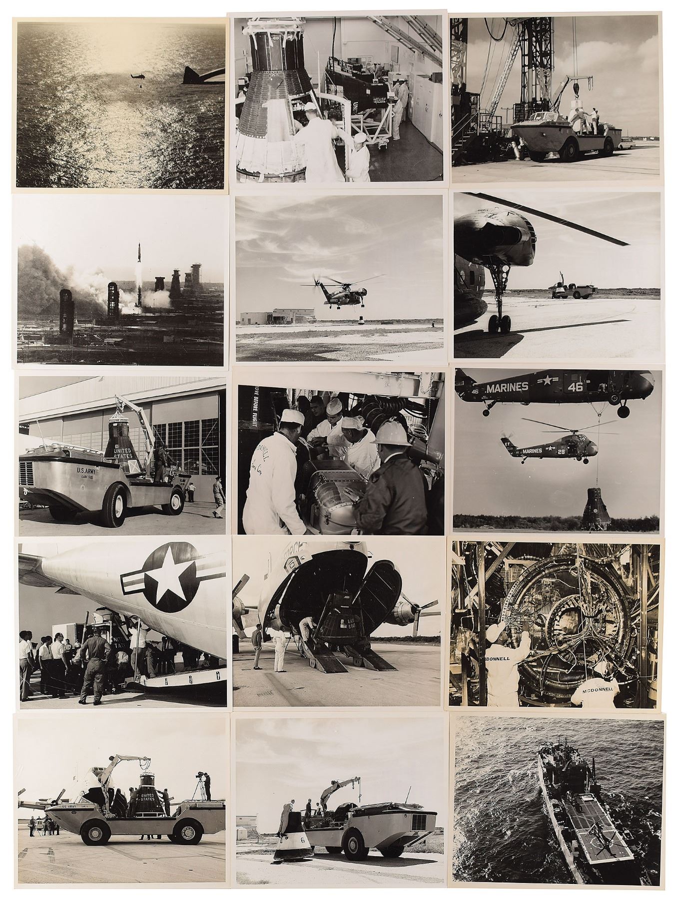 Interesting collection of 24 vintage original NASA photographs documenting pre- and post-flight activities for early Mercury-Redstone and Mercury-Atlas missions, each glossy finished, ranging in size from 10 x 8 to 8 x 10.5, with the majority bearing NASA caption text on reverse. This photographic collection is quite diverse, with the following a mere sample of the included images: the recovery of the Mercury-Redstone 2 and its chimpanzee occupant Ham; McDonnell technicians testing a large pressure bulkhead; a practice egress for the Liberty Bell 7 spacecraft; the erection of a Scout Missile at Pad 18; the return of the Mercury-Atlas 5 capsule; the safe return of the Sigma 7 spacecraft; and the USS Donner heading to the landing site of the Mercury-Redstone 2 capsule. In overall very good to fine condition, with slight edgewear and some missing corner tips.