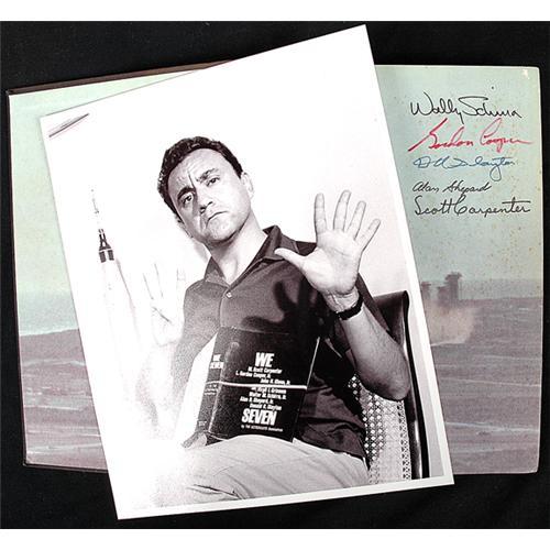 <Our item number 138588><B>Mercury Program, c1960, "We Seven" Autographed Book.</B> Signed by the Mercury Seven astronauts, "Themselves" (1962, Second Printing, 352pp., hard without dust jacket). This copy is signed inside the front cover by Wally Schirra, Gordon Cooper (red ink), Deke Slayton (blue ink), Alan Shepard and Scott Carpenter. The book is extensively foxed around the edges from having spent years in the consignor's library in Hawaii. ALSO included is an early 8x10" black and white photo (on Agfa film) of the consignor with THIS book on his lap and holding up EIGHT fingers, indicative of his being the unofficial 8th Mercury astronaut. A great piece of memorabilia. <BR>Estimated Value $250 - 350. <I><BR>Ex. the comedian Bill Dana/Jose Jimenez collection.</I> <BR><BR>Our item number 138588<BR><IMAGES><P ALIGN="CENTER"><IMG SRC="http://www.goldbergcoins.net/liveauction/49jpegs/138588.jpg"> </P></IMAGES>