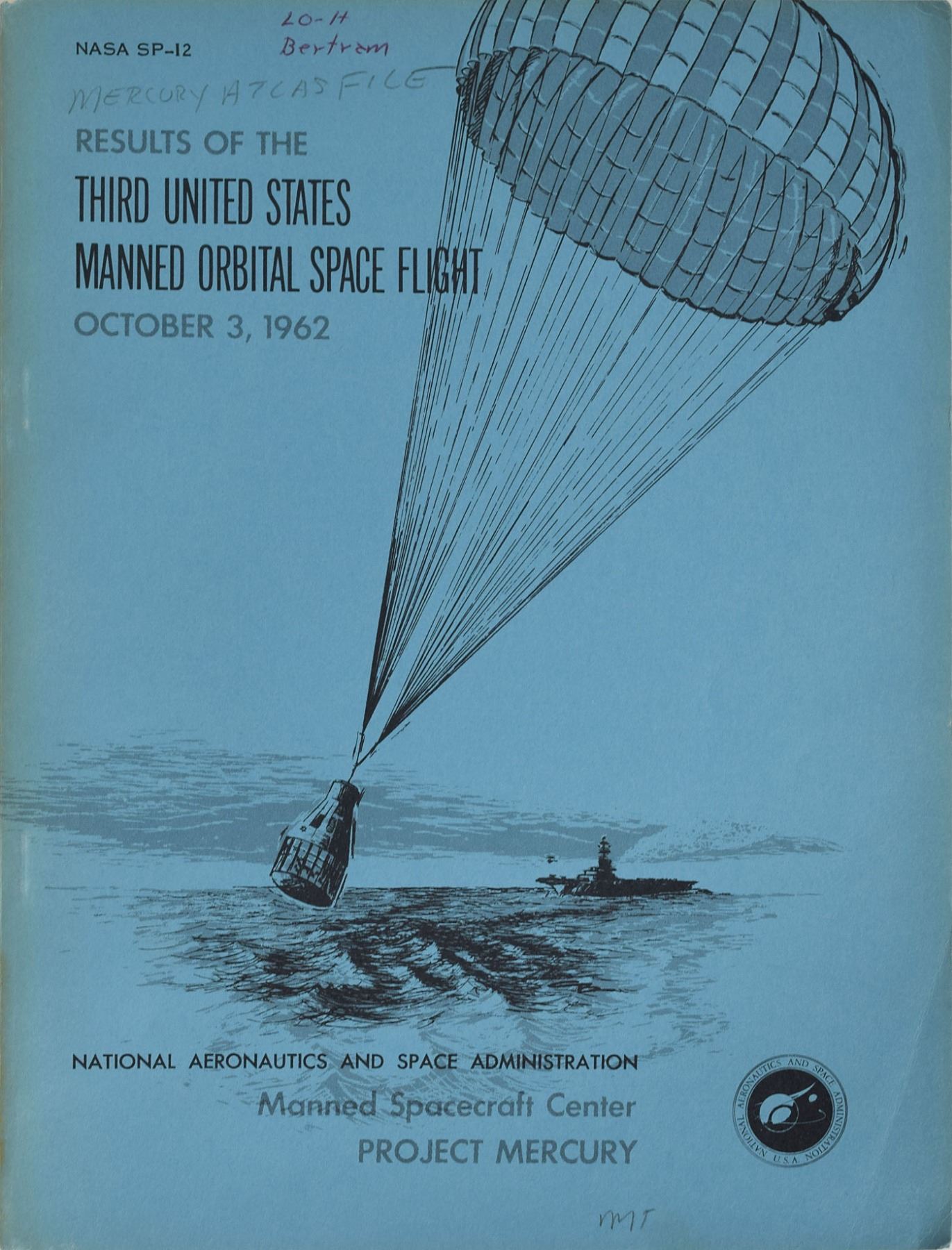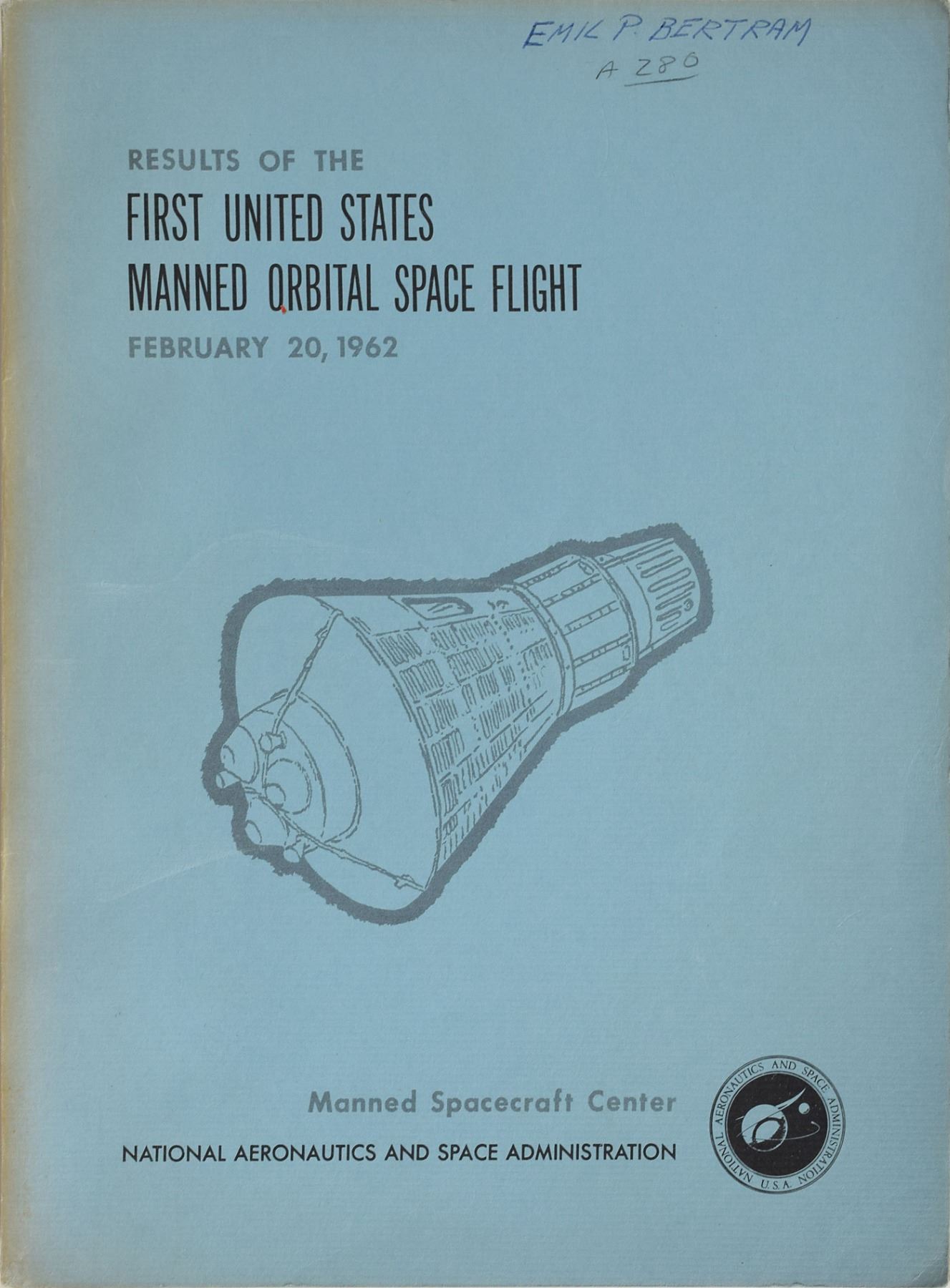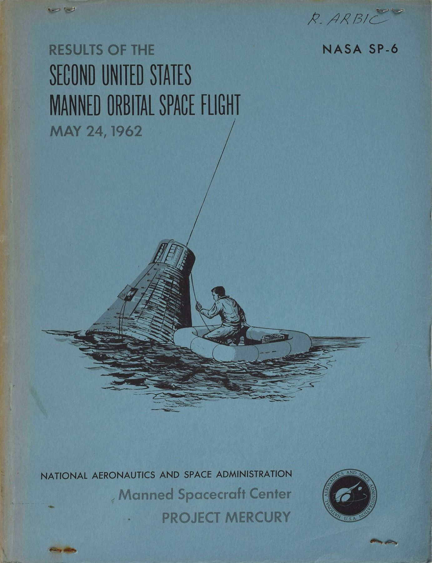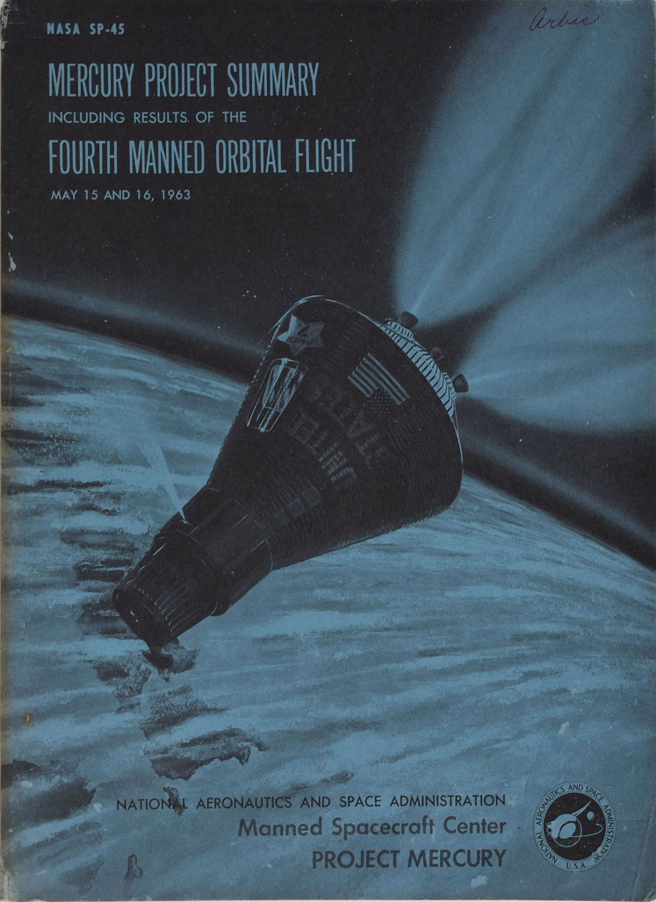 Four official softcover NASA publications for the first four flights of the Mercury program: Results of the First United States Manned Orbital Space Flight, February 20, 1962; Results of the Second United States Manned Orbital Space Flight, May 24, 1962 (NASA SP-6); Results of the Third United States Manned Orbital Space Flight, October 3, 1962 (NASA SP-12); and Project Mercury Summary, Including Results of the Fourth Manned Orbital Flight, May 15 and 16, 1963 (NASA SP-45). In overall fine condition, with sunning to the spines and ownership notations to covers.