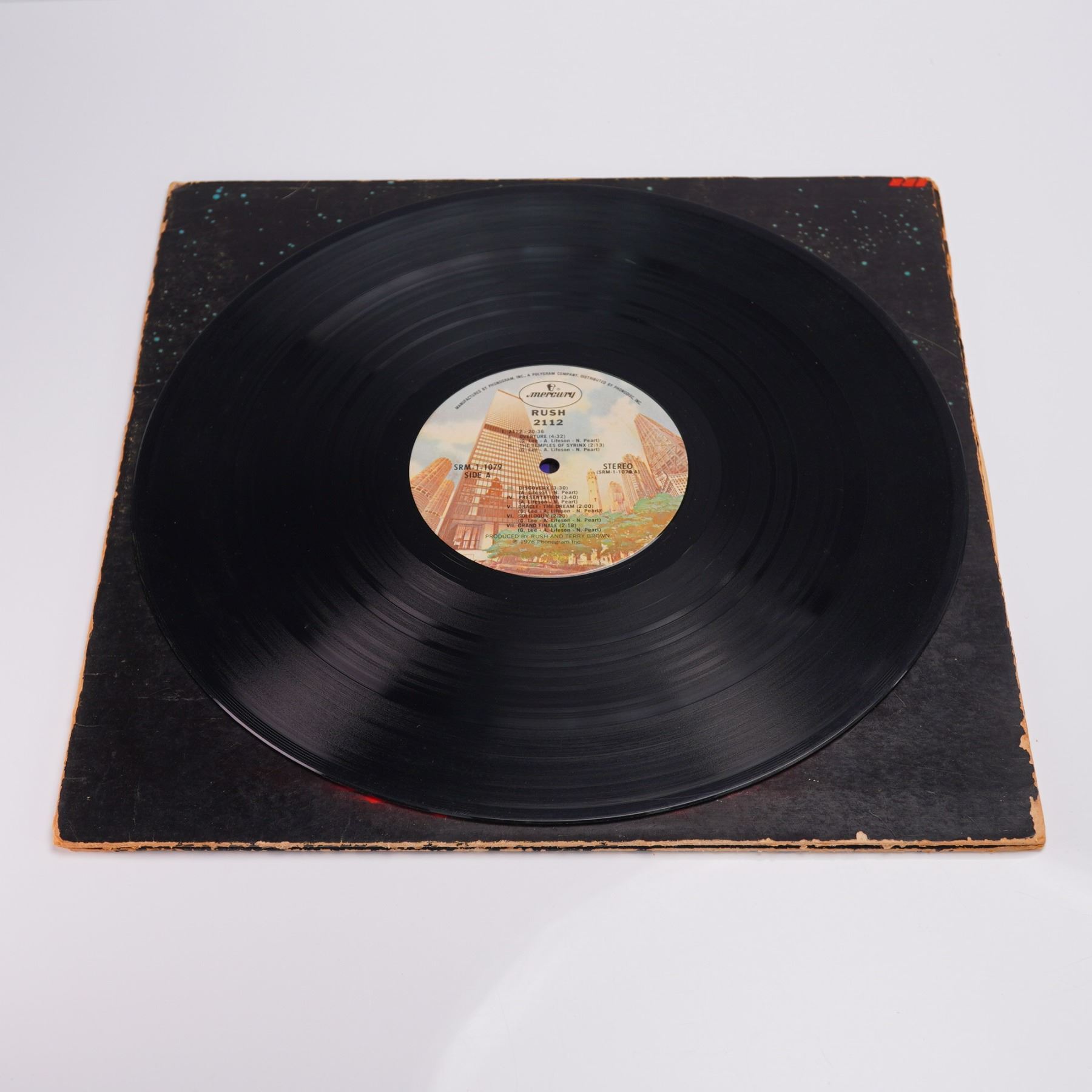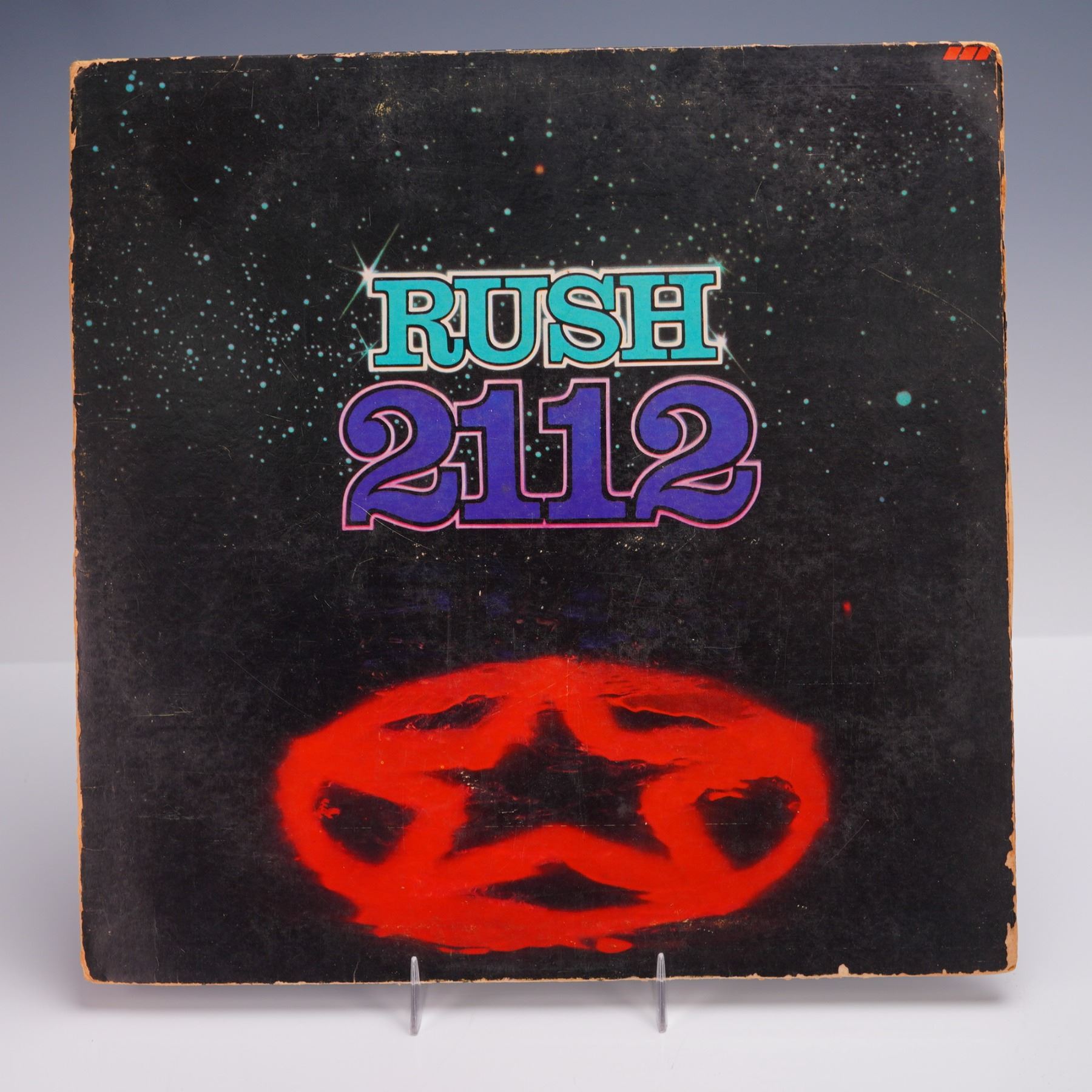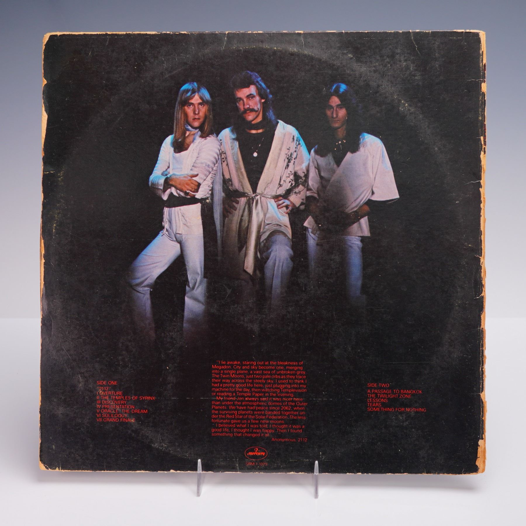 An original 1976 Mercury Records stereo pressing of "2112" by Canadian progressive rock band Rush. This seminal studio album features the iconic seven-part title suite "2112" occupying the entirety of Side One, blending science fiction narrative with complex instrumental passages, and continues on Side Two with individual tracks including "A Passage to Bangkok," "The Twilight Zone," "Lessons," "Tears," and "Something for Nothing." The outer jacket showcases the band's famed red starman emblem beneath a cosmic starfield and includes band portrait photography on the reverse. The vinyl bears the Mercury skyscraper label design.