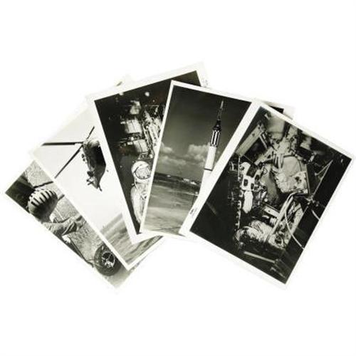 <B>Mercury Redstone 3 - Collection of Nine Official NASA Photos.</B></I> One is an 8" x 10" original color glossy with a red NASA image number in the right margin, and eight are black & white images with black NASA photo numbers. The color photo is a liftoff shot. The black & white photos depict various training sessions, a publicity shot of the Freedom 7 capsule, and two shots of Alan Shepard within the capsule itself. Overall very fine condition. <I>From the collection of renowned former physical trainer of the astronauts Joe Garino. This lot is accompanied by a signed certificate of authentication from Garino verifying its provenance.</B></I><BR><BR><b>Shipping:</b> Flat Material, Small (<a target="_blank" href="http://www.heritageauctions.com/common/shipping.php">view shipping information</a>)