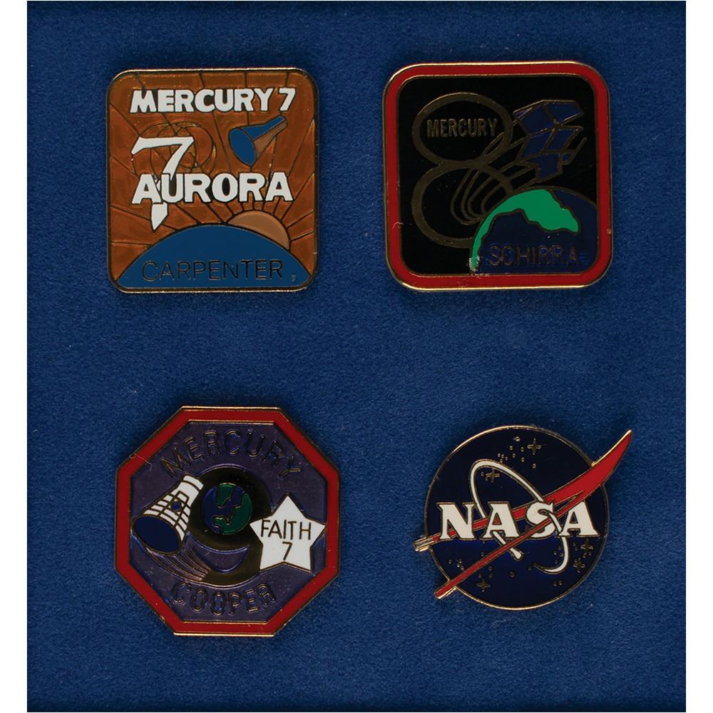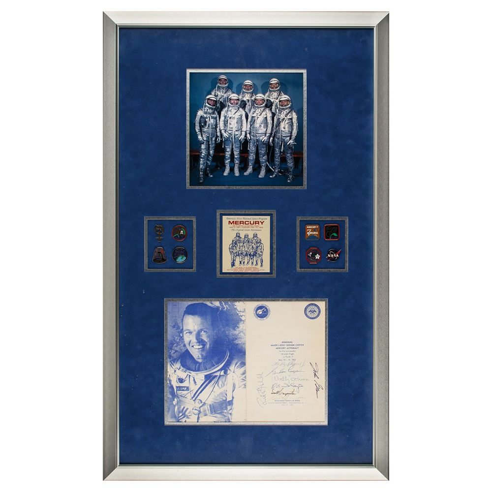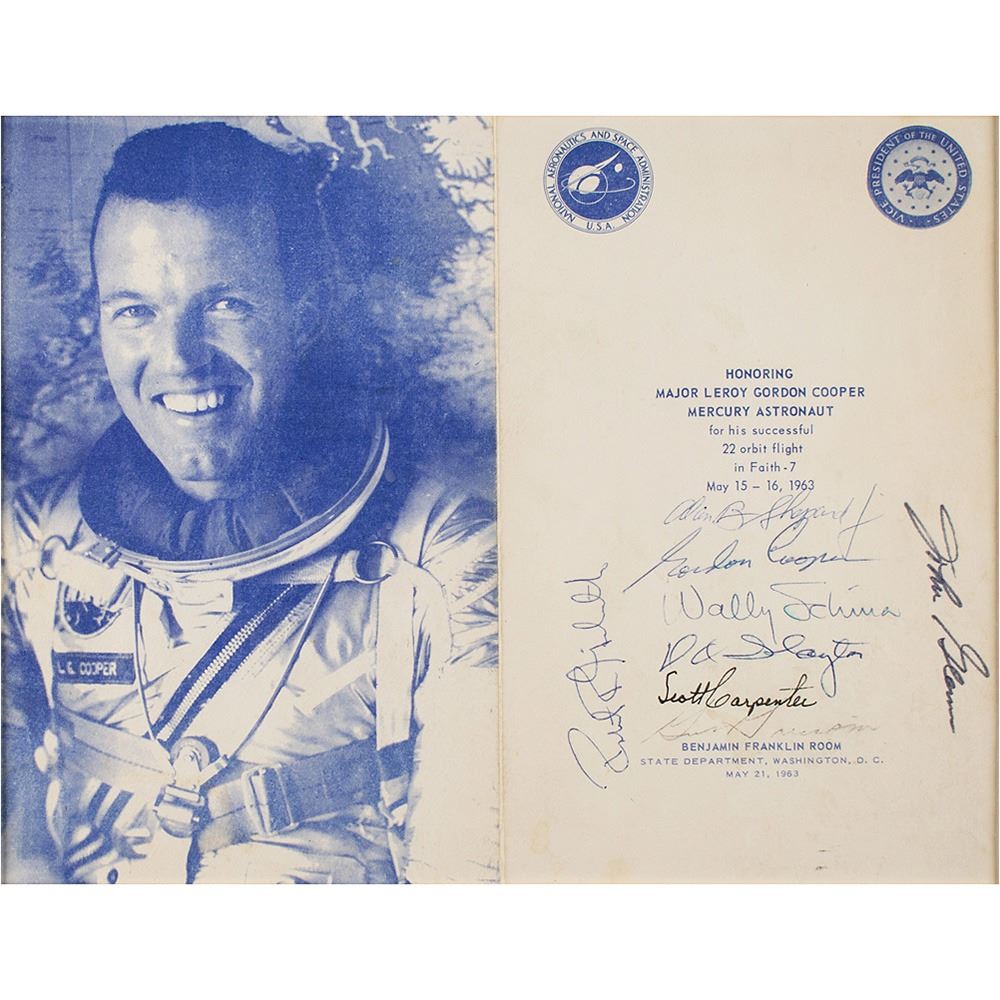Original program for an event “Honoring Major Leroy Gordon Cooper, Mercury Astronaut, for his successful 22 orbit flight in Faith 7,” held in the Benjamin Franklin Room at the State Department on May 21, 1963, measures 10.25 x 8 unfolded, signed in ink and ballpoint by all seven original Mercury astronauts: “Alan B. Shepard, Jr.,” “Gordon Cooper,” “Wally Schirra,” “DK Slayton,” “Scott Carpenter,” “Gus Grissom,” and “John Glenn.” The program is also signed by aerospace pioneer Robert Gilruth, the first director of NASA's Manned Spacecraft Center.” Attractively double-matted and framed with a group photo, plaque, and eight NASA and Mercury Program pins to an overall size of 19 x 31. In fine condition, with some faint staining. This special event was highlighted the presence of President John F. Kennedy, who delivered an inspirational speech aimed at the bravery of Cooper and his fellow astronauts, while again doubling down on his belief that man would walk on the moon by the end of the 1960s. Earlier that day at the White House, President Kennedy presented Major Cooper with the National Aeronautics and Space Administration (NASA) Distinguished Service Medal.
