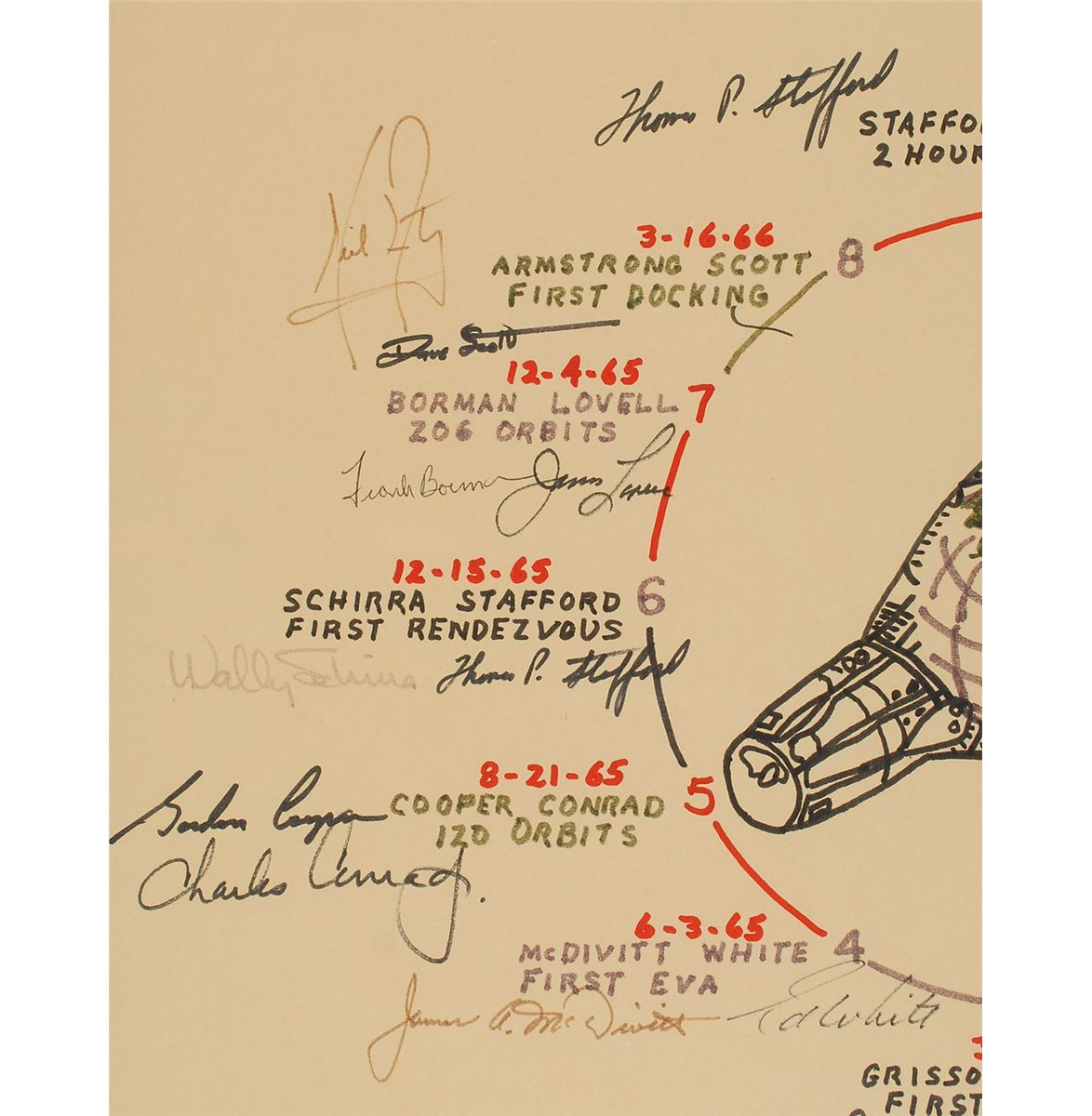 Distinctive hand-drawn display depicting the Mercury and Gemini spacecraft and listing the names of each mission, 16.5 x 18.5, signed in felt tip and ballpoint next to the mission name by all members of the prime crew: Alan Shepard [MR-3]; Gus Grissom [MR-4]; John Glenn [MA-6]; Scott Carpenter [MA-7]; Wally Schirra [MA-8]; Gordon Cooper [MA-9]; Gus Grissom and John Young [Gemini 3]; Jim McDivitt and Ed White [Gemini 4]; Gordon Cooper and Charles Conrad [Gemini 5]; Wally Schirra and Tom Stafford [Gemini 6]; Frank Borman and Jim Lovell [Gemini 7]; Neil Armstrong and Dave Scott [Gemini 8]; Tom Stafford and Gene Cernan [Gemini 9]; John Young and Michael Collins [Gemini 10]; Charles Conrad and Richard Gordon [Gemini 11]; and Jim Lovell and Buzz Aldrin [Gemini 12]. Matted and framed to an overall size of 26 x 29. In fine condition, with some signatures naturally faded with age, though most remain quite bold. Though unclear exactly who this display was originally created for, its incredible, one-of-a-kind nature implies it was for someone of importance. A positively stunning display with an astounding group of names—every astronaut from every pre-Apollo manned mission—representing these two early NASA programs. Oversized.