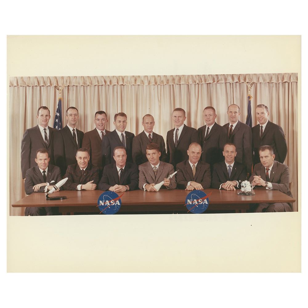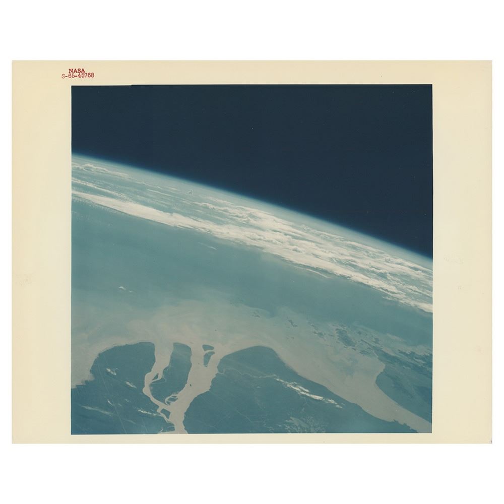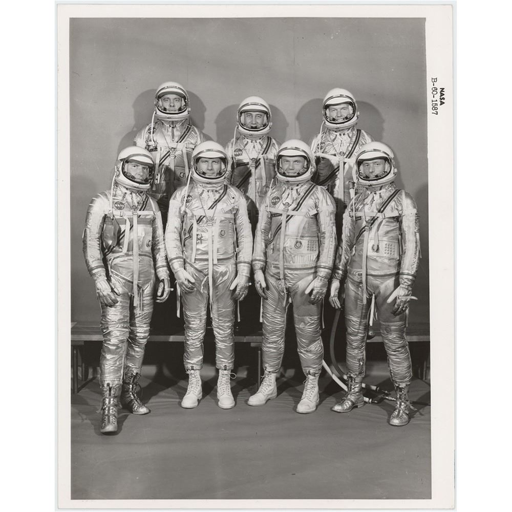 Three official glossy 'Type 1' photos from the Mercury and Gemini programs, including a black-numbered photo of the original Mercury 7 astronauts in their silver suits (B-60-1567), a color photo of Astronaut Groups 1 and 2 together (S-63-1419), and a color red-numbered photo of the mouth of the Yangtze River in China taken onboard the orbiting Gemini 5 spacecraft (S-65-45768). All bear purple NASA caption text on the reverse, and the color photos have "A Kodak Paper" watermarks. In fine condition.